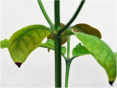 - Se distingue por la presencia de pequeñas manchas amarillas, anaranjadas y otras negras en el haz de las hojas.