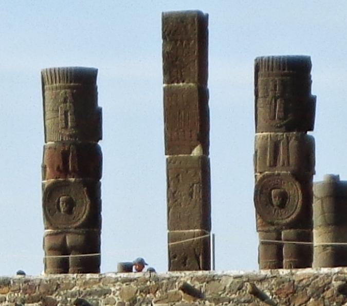 Los enormes atlantes y las pilastras con relieves que hoy coronan la pirámide, no se encontraban a la vista del pueblo en la época prehispánica, servían de apoyo al techo del templo que había en la parte superior. Las columnas en forma de serpientes emplumadas se encontraban a la entrada del templo.