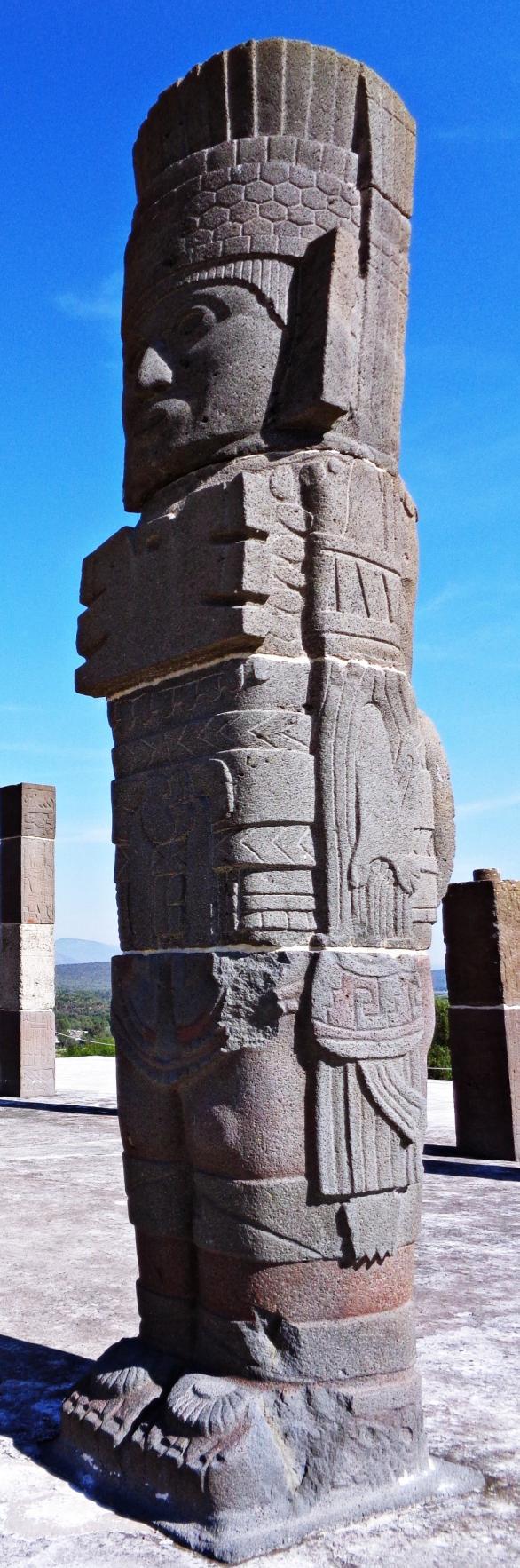 Cada atlante se compone de cuatro secciones, que embonan una en otra, alcanzando una altura de 4.60 metros, representan a un guerrero ataviado con un tocado que simula una banda cuajada de estrellas rematado por plumas y atado en la nuca mediante un nudo. El rostro tuvo una decoración pintada y es probable que la cuenca vaciada de los ojos y boca estuviese con alguna incrustación, los cabellos están simulados en líneas verticales. Como adornos el personaje lleva orejeras rectangulares, un gran pectoral en forma de mariposa estilizada, collares de cuentas y un cinturón con broche superior que ostenta una enorme hebilla, probablemente representación del sol bajo el aspecto de una cara humana sobresaliendo de un disco en el que se distinguen cuatro serpientes separadas por fajas radiales. Viste el guerrero un taparrabo bordado, ajorcas, tobilleras y sandalias adornadas con serpientes em plumadas, Va armado con un “atlatl” (lanzadardos) que empuña en la mano derecha, mientras que sujeta con la izquierda los dardos respectivos, así como una característica espada curva y una bolsa de copal.