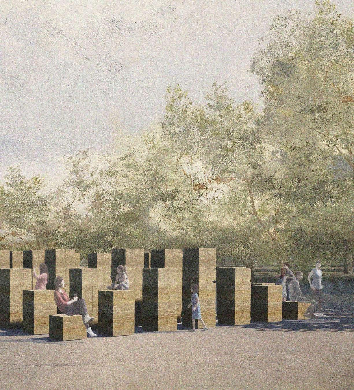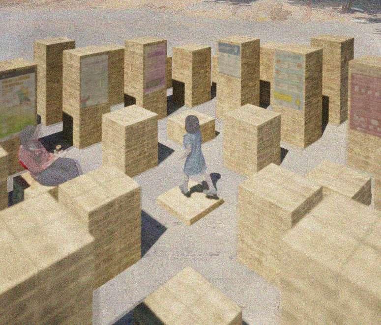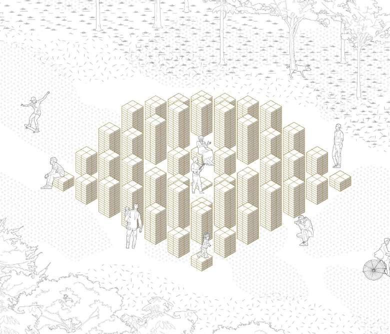 El pabellón está conformado por 49 torres con una base de cuatro bloques de adobe de 30cm x 30cm x 10cm, cada una de estas torres suma diferentes alturas para construir espacios multifuncionales, se plantea comenzar con un foro al aire libre que funcione de espacio de exhibiciones, donde de igual forma se busque explicar la principal dinámica del pabellón, que es, la posibilidad de reagrupar la piezas según las necesidades inmediatas de los habitantes, generando instalaciones para juegos, talleres, comercio o exhibiciones.