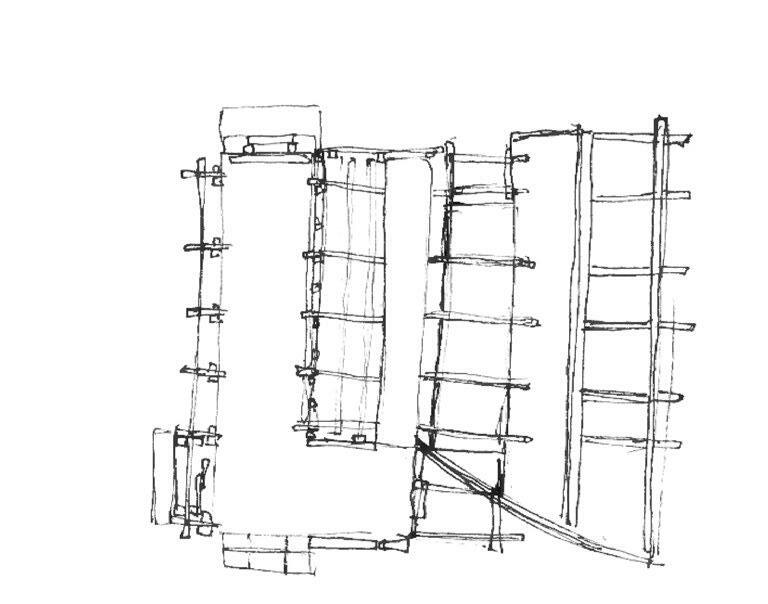 The facade is created out of natural bark off cuts. These off cuts create a rough and natural textural quality to the pavilion. Through the uneven and staggered layering of the off cuts, some light penetration occurs. The bark was found on-site, making this facade both visually appealing and sustainably sourced. The tree bark pieces are supported by the double-curved sub-structure, allowing for an interesting curve pattern to occur as the wood is stacked in a slanted angle. These thick, randomly sized pieces create an interesting juxtoposition against the graceful and light structure underneath.