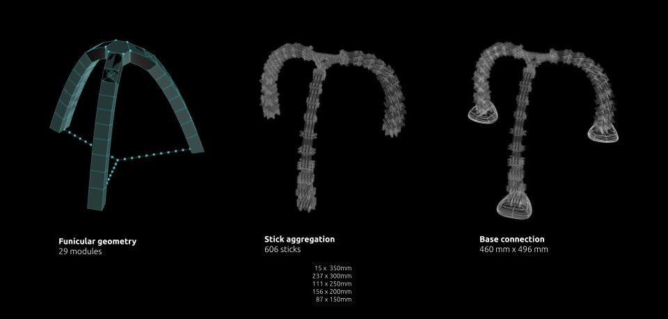 The aim of this project is to create a free standing funicular geometry with three legs. There are 19 modules per leg with a triangular middle piece to connect the legs and hold them up with tension. These legs stand at a little more than two meters in height and were completed with the help of pick and place techniques.
