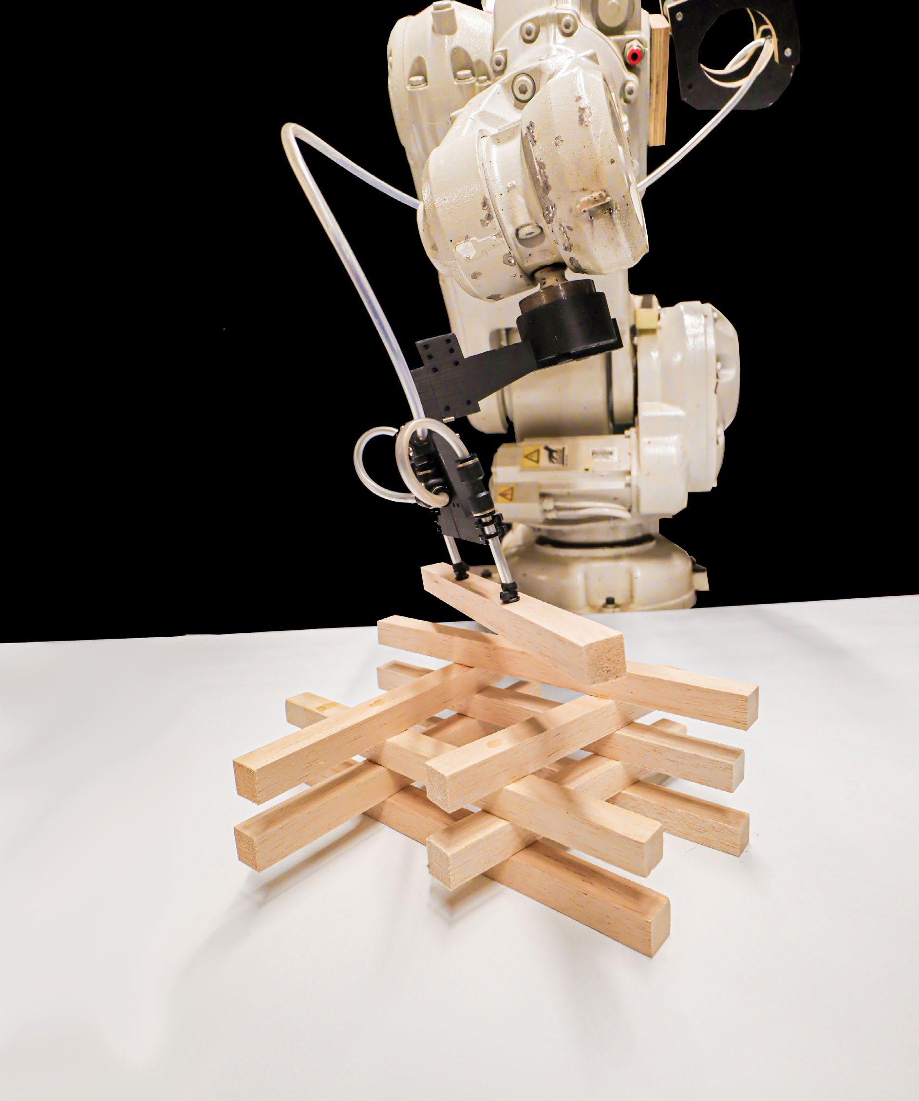 The robotic arms also were used to feed glue onto the sticks in order to secure them together. with this technique, minimal human interference is needed to complete this pick and place project.