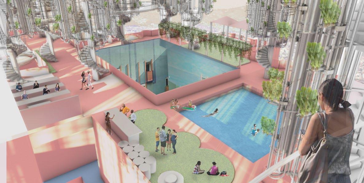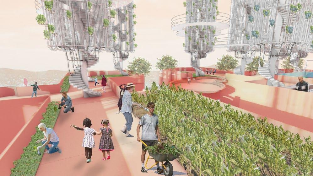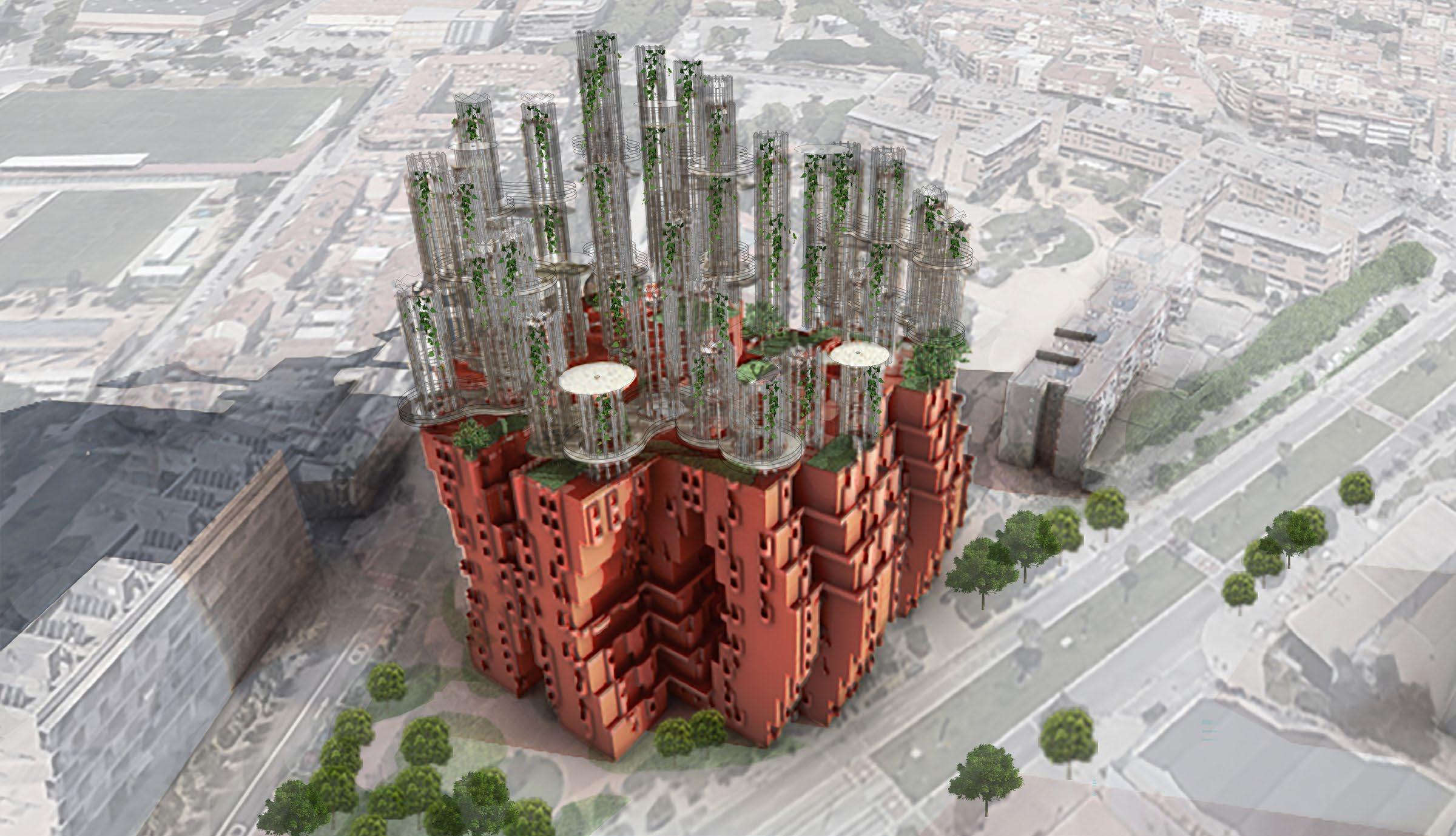 This roof addition creates a more sustainable diet for the local Spaniards by meeting 100% of Walden 7’s produce needs. This significantly reduces the community’s carbon footprint by bringing the vegetables to them and cutting down on food miles. The area of these towers is optimized by extending the growing space vertically with respect to sun and shade levels. The towers rotate in order to provide optimum sunlight and wind protection to the growing plants. These towers take up minimal floor space in order to utilize the remaining roof space for community activities that are often dominated and dictated by the produce that is grown in the towers.