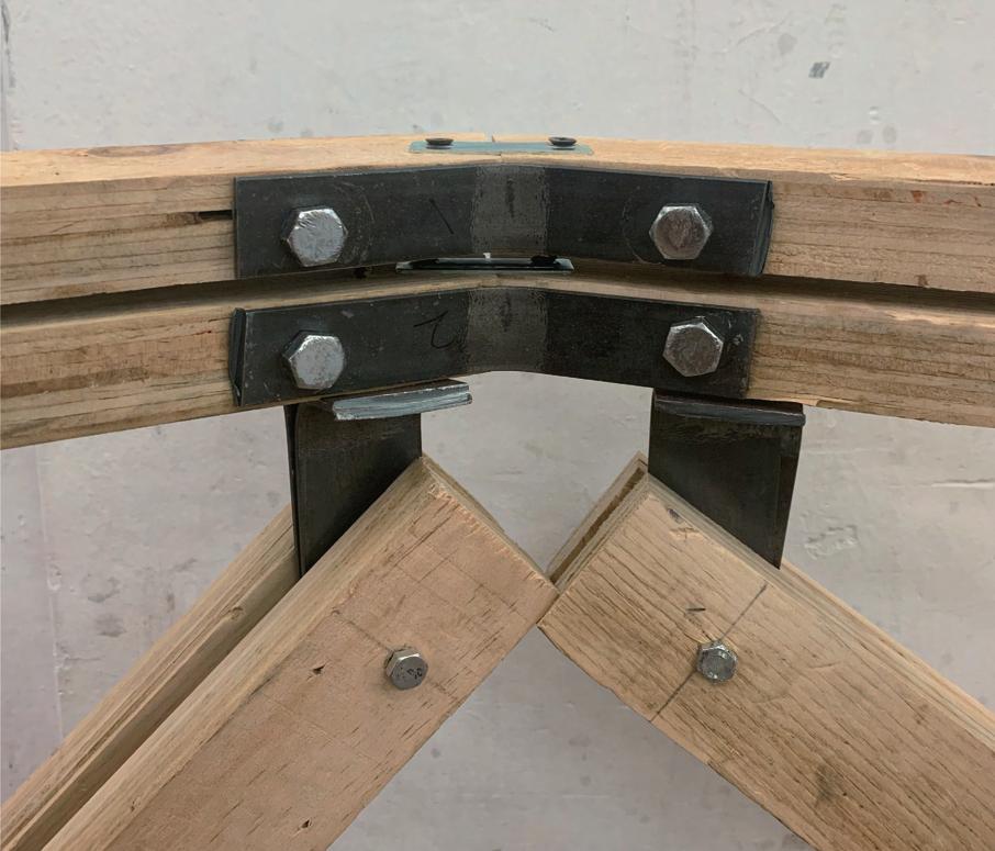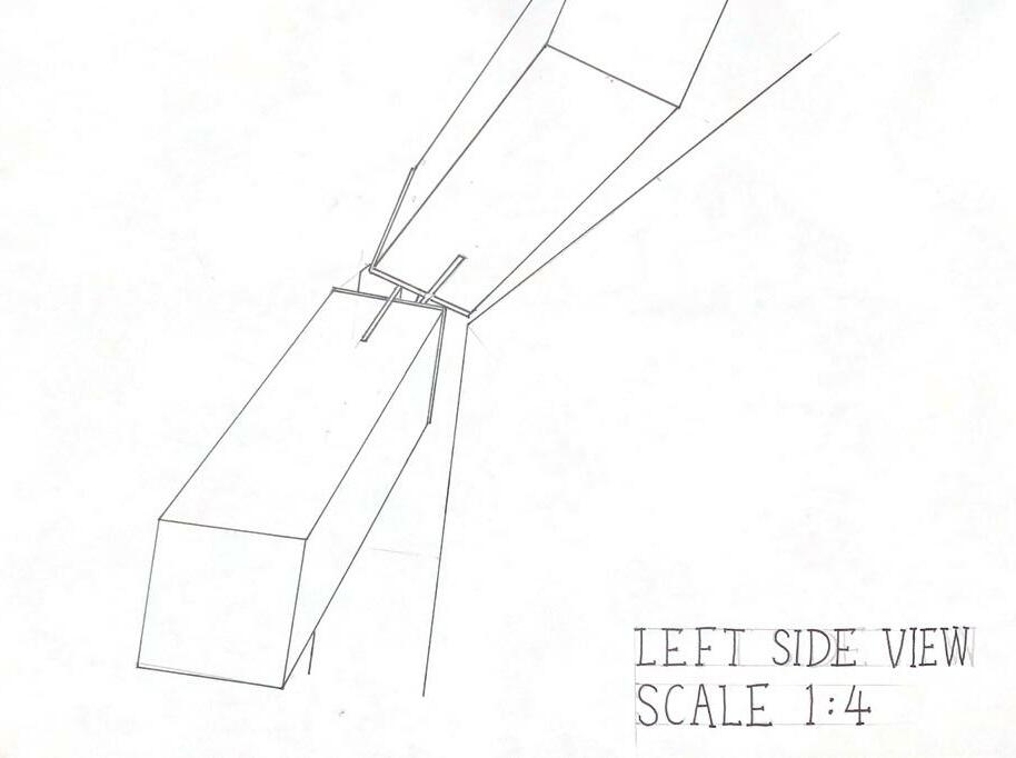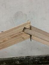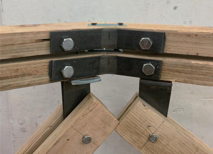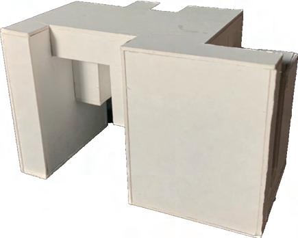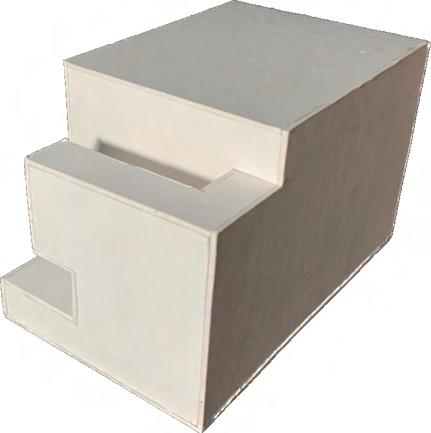 八顆16*10*10的立方體以卡接的方式連 接,需承受磚頭重量。透過探討空間虛實的 結構關係,強化一串立方體的承重強度。鍛 鍊刀工,刀工的好壞也影響承重強度。 第二顆立方體的內部空間相當有趣,被 我用來作為第三題砌築的發想。 解讀材料細部與空間特質關係,聚焦於 構造上形式與材料運用特性。學習不同 材料的銜接語法,操作回應空間關係之 設計。