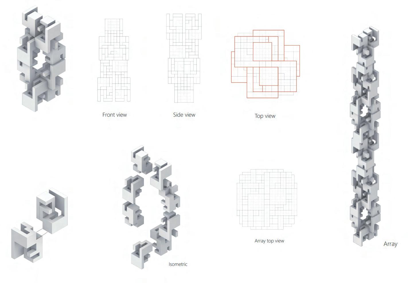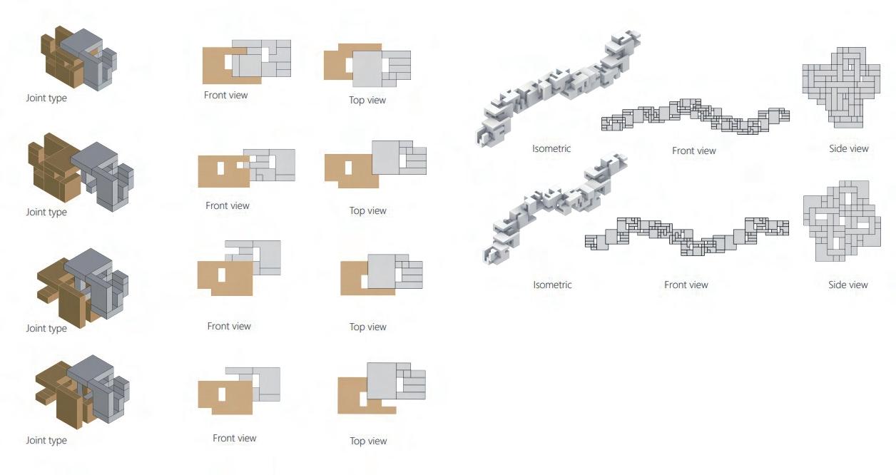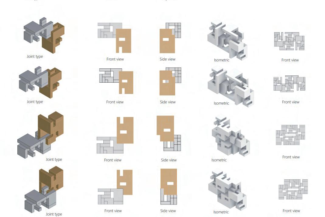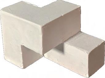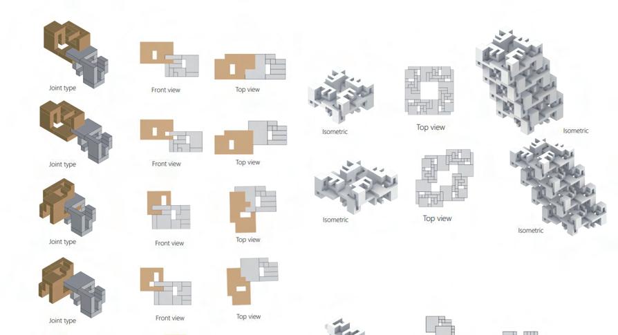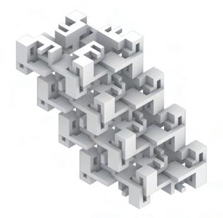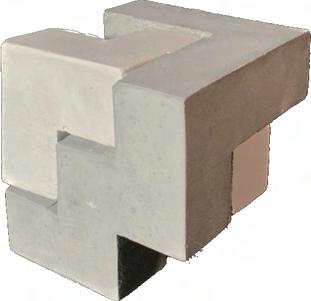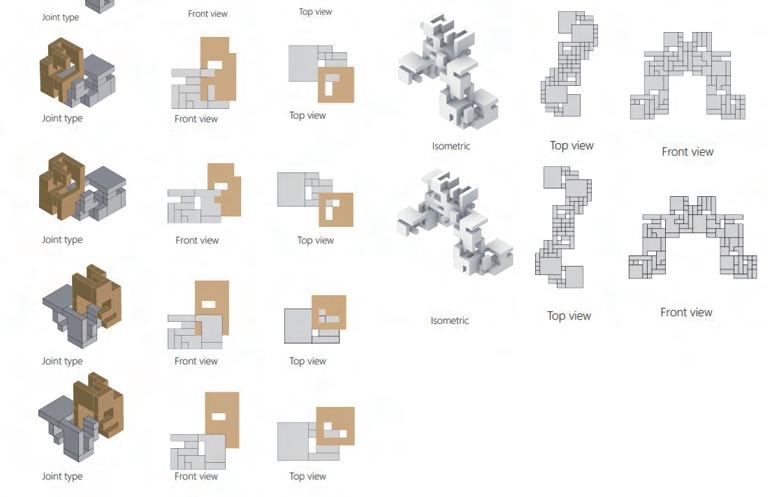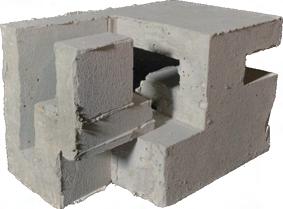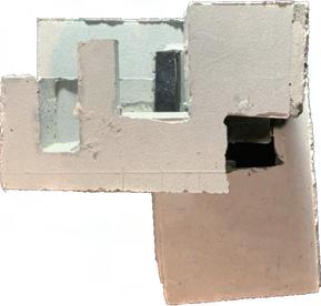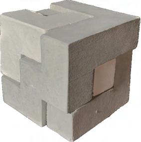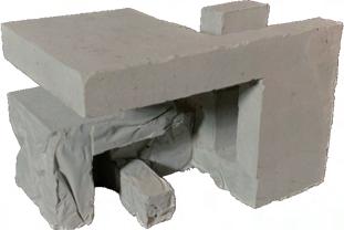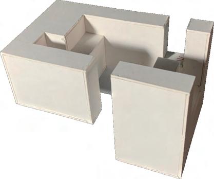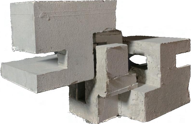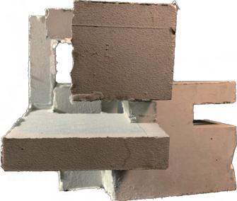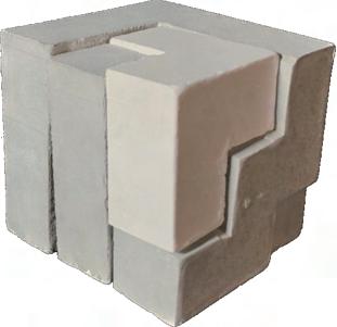 八顆16*10*10的立方體以卡接的方式連 接,需承受磚頭重量。透過探討空間虛實的 結構關係,強化一串立方體的承重強度。鍛 鍊刀工,刀工的好壞也影響承重強度。 第二顆立方體的內部空間相當有趣,被 我用來作為第三題砌築的發想。 延續第二題單元,修改虛實空間後,用重複 堆疊與細部漸變做出紋理,並嘗試運用不同 材料灌注。