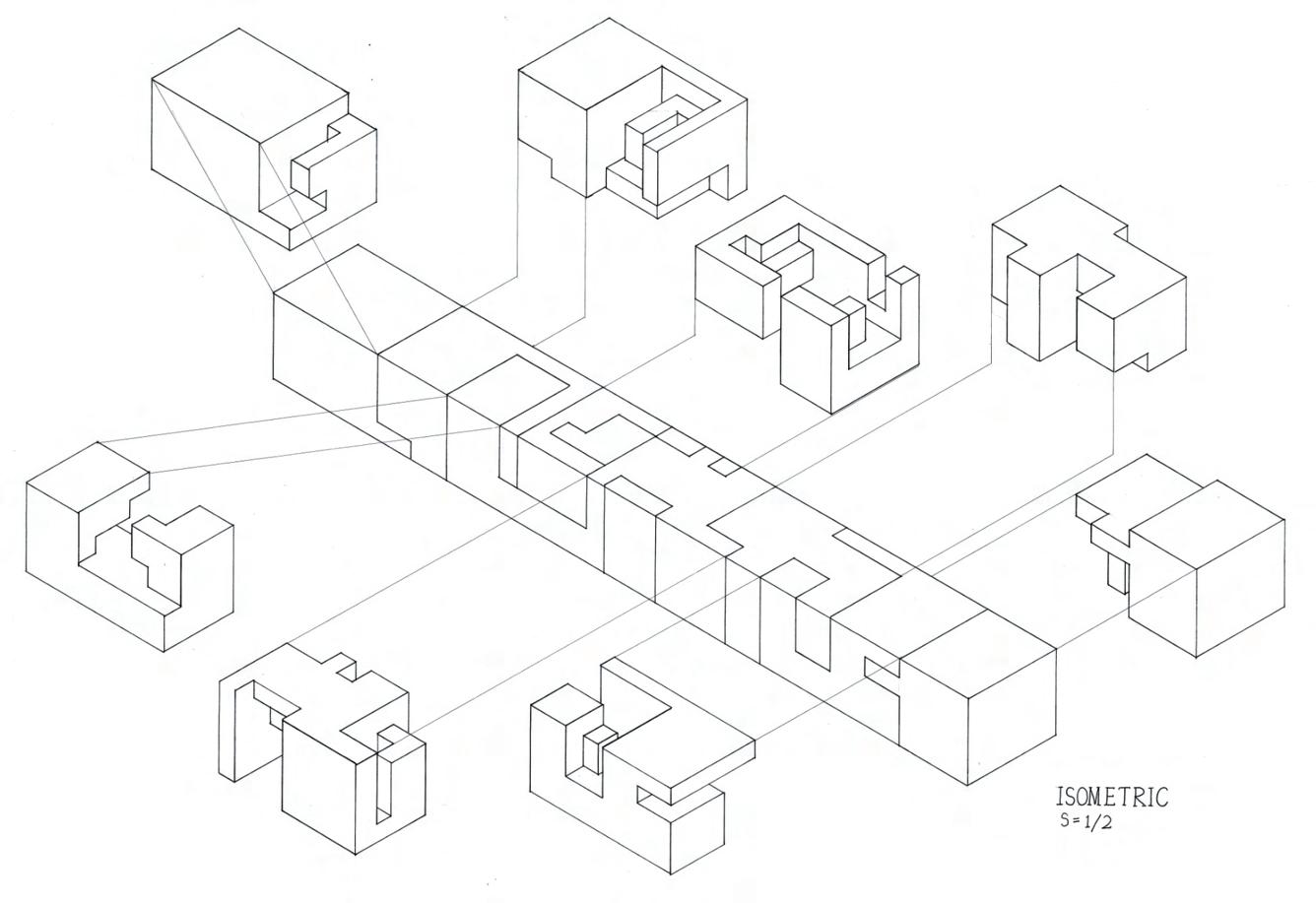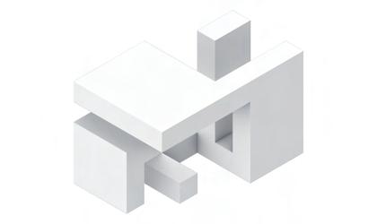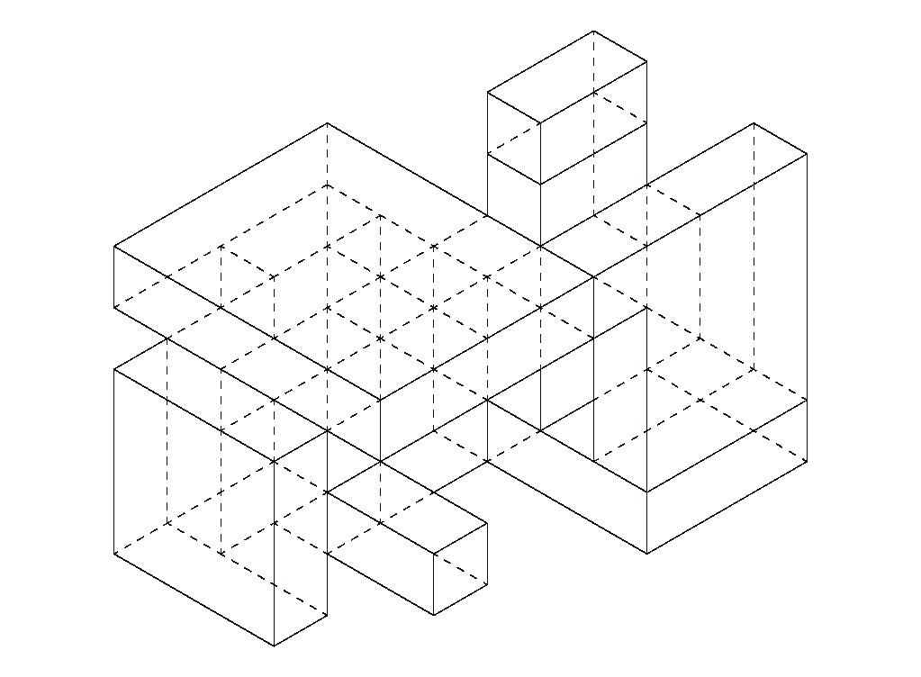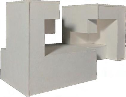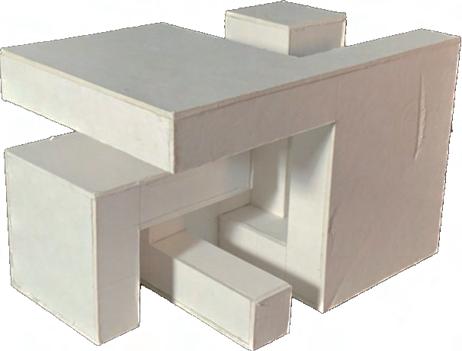 八顆16*10*10的立方體以卡接的方式連 接,需承受磚頭重量。透過探討空間虛實的 結構關係,強化一串立方體的承重強度。鍛 鍊刀工,刀工的好壞也影響承重強度。 第二顆立方體的內部空間相當有趣,被 我用來作為第三題砌築的發想。 學習2D圖面的抽象畫與幾何化的方法。 認識不同平面圖轉化立體的方式。透過 閱讀、詮釋、分析、重繪與轉化理解何 謂抽象概念。