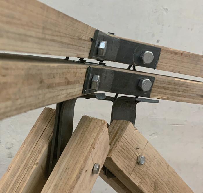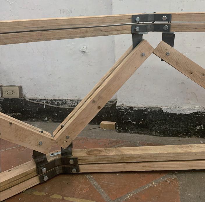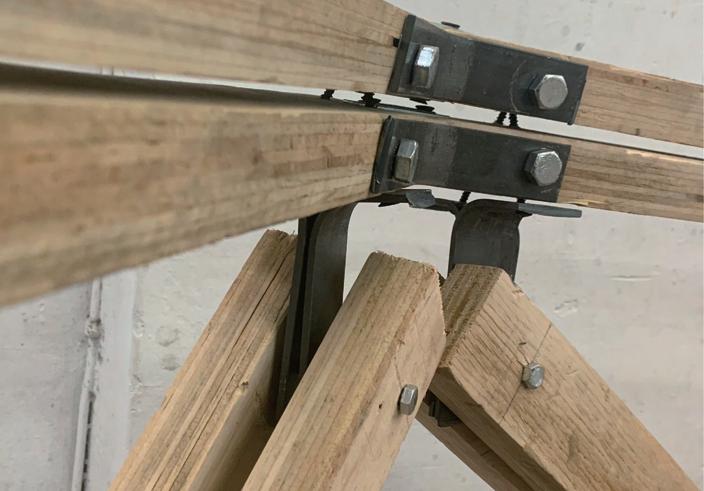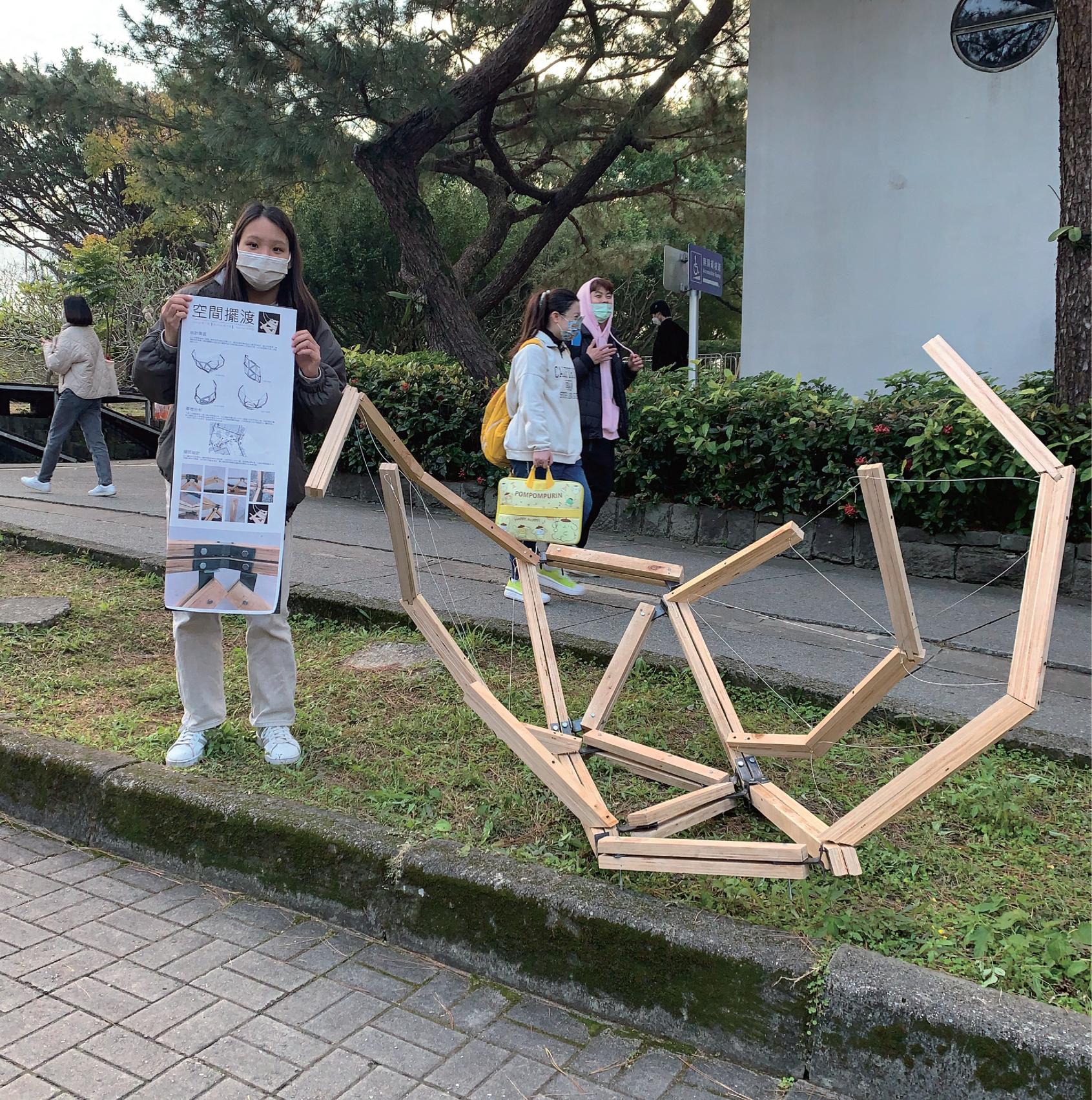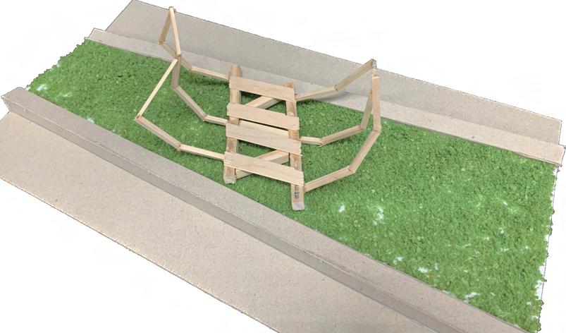 ISOMATRIC TOP VIEW SIDE VIEW FRONT VIEW 在人潮匯集處搭一座橋,觀察是否有辦法改變人流。橋的型態呼應到基地人數突然增加,產生空間壅擠,體 積膨脹的感覺。橋面翹翹板的設計和可擺動的扶手與經過這座橋的人們達成互動,並且裝置倒向呈現人們經 過的方向。 空間擺渡 Group:第一組 Author:陳方捷 Teacher:柯純融 設計圖面 基地分析 細部設計 下課十分鐘期間從工學大樓和教育館出來,往文學館和廣弘軒方向的人潮遠大於反方向的人潮。同時從黑天鵝 展示廳湧出的人潮匯集於建築系館前方的斜坡使空間瞬間變得擁擠。尤其是斜坡上的分隔島其中一邊特別多人 ,若是下雨天大家撐傘,更能感受到這個現象。 以八邊形的主結構加上連結接點與接點的副結構,分散來自上方的力量,使結構能構承重。主副結構連接點用L型 角鐵和螺絲做轉軸。扶手部分用鋼索連接,讓人經過橋梁翹翹板擺動時能帶動扶手跟著晃動。 43