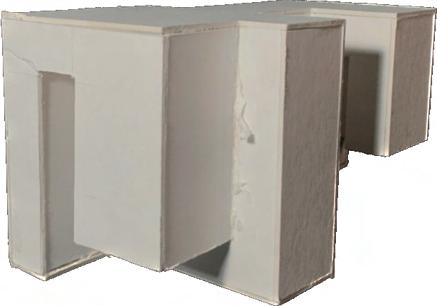 八顆16*10*10的立方體以卡接的方式連 接,需承受磚頭重量。透過探討空間虛實的 結構關係,強化一串立方體的承重強度。鍛 鍊刀工,刀工的好壞也影響承重強度。 第二顆立方體的內部空間相當有趣,被 我用來作為第三題砌築的發想。 承接第四題細部語法,運用材料特 性,以一比一材料操作。
