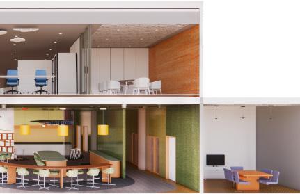 I rendered a few of the views our team completed. This includes two section perspectives and two axons. The renderings were created in Revit paired with Enscape and feature a cut through the reception, the feature stair, and the community space, as well as a cut through the patio and cafe space. The axons feauture a lactation room and a huddle room. Our team stuck to a color palette of greens, blues, orange, reds, and yellow.