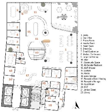 The project was started with a lot of research about San Jose, Costa Rica, and a client interview with a coffee shop based in Seattle, Washington. Our team had to gather facts about the city and business we were given to then create a logo for our new company. The office is located in a large building, but our company is located on the second and third floors. The second floor is meant to be the social floor. There is a community space complete with a cafe and library, as well as access to an outdoor patio. This floor is where anyone would check in with reception, and it is a collaboration floor.