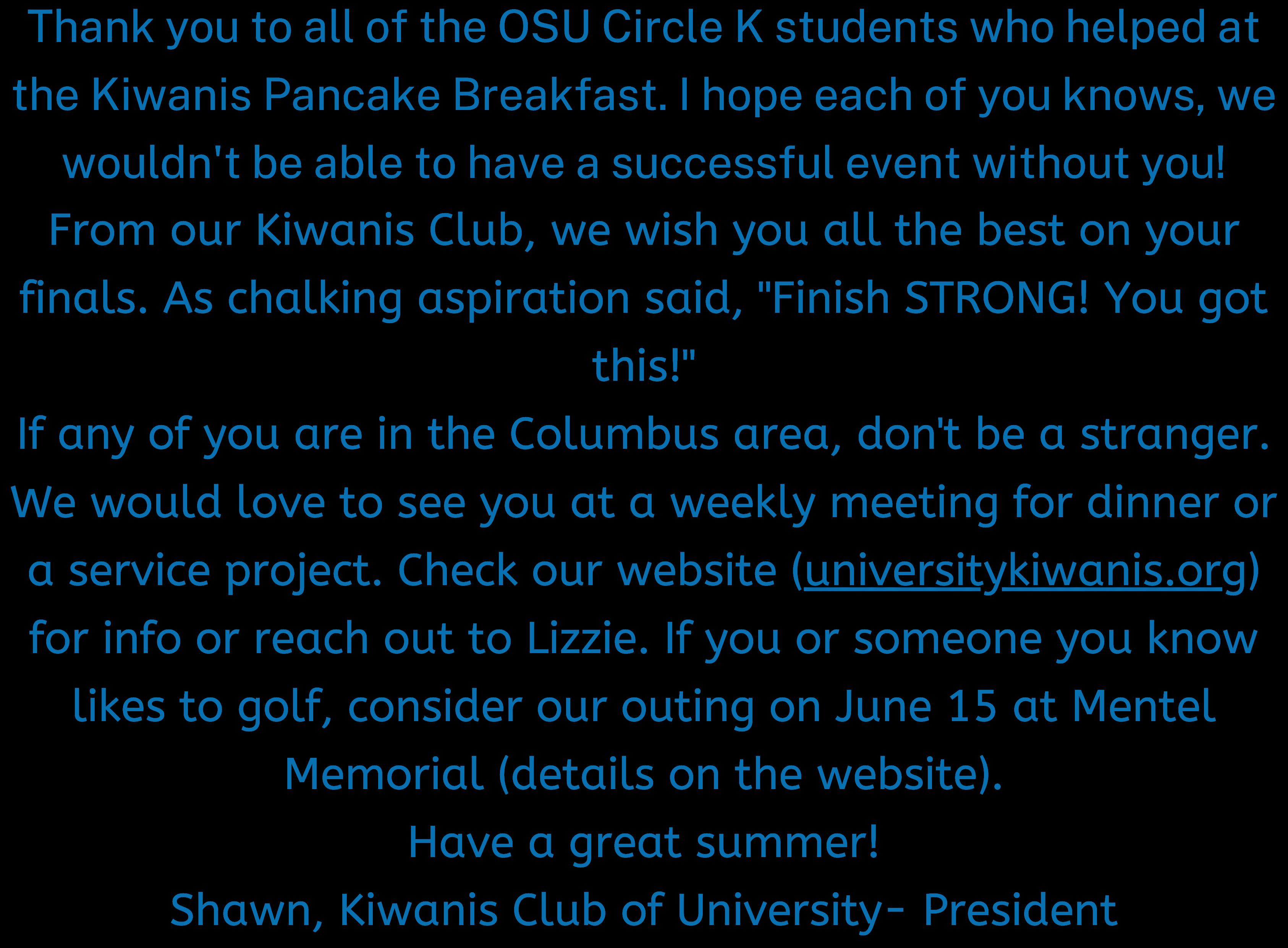 Thank you all for being a part of this organization. It’s because of our members that we are the MIGHTY Ohio District of Circle K International. I look forward to serving with you all soon! It’s going to be a great year!