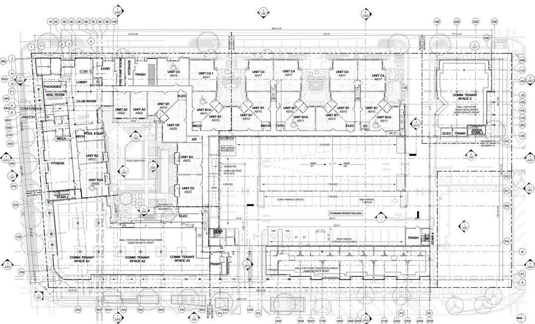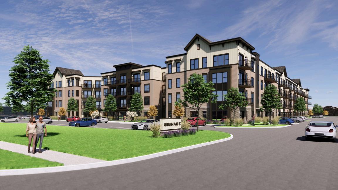 This mixed-use development features a wrap-style building with residential units above and retail or restaurant spaces at street level, activating the pedestrian experience The Main Street façade is articulated with varied materials and façade treatments to create the appearance of multiple distinct buildings, enhancing visual interest and blending with the urban context The design supports a vibrant, walkable community with a strong connection between living, working, and leisure spaces