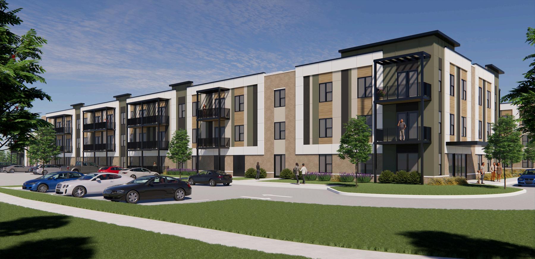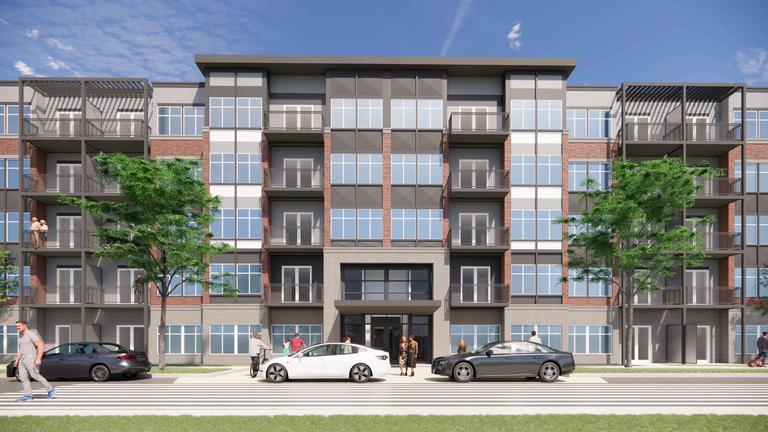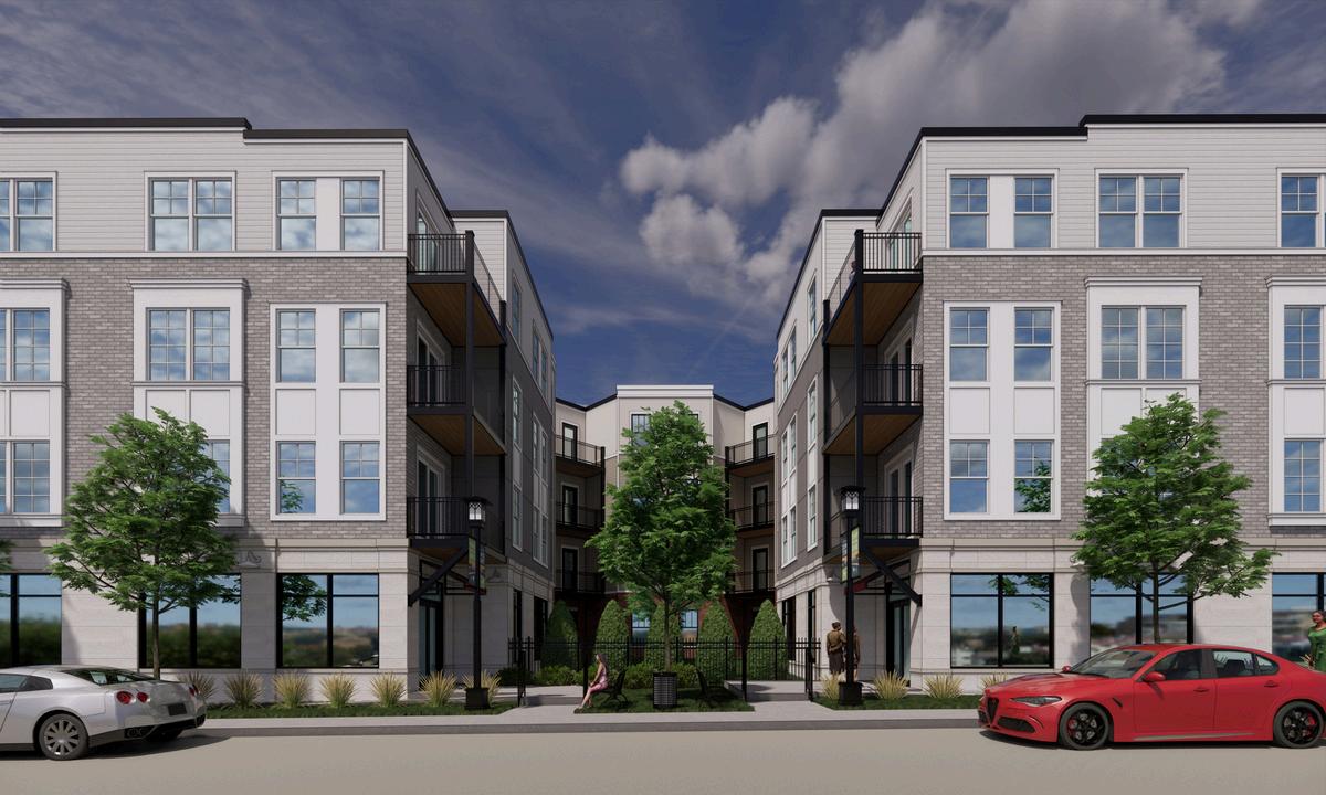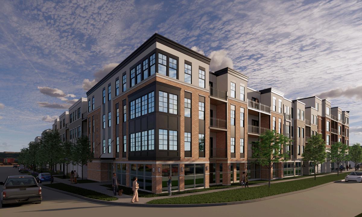 This transit-oriented development features a prominent multi-family apartment building accompanied by a trio of townhome-style residences, offering convenient housing options for commuters The design embraces an industrial aesthetic, featuring metal accents and brick to reflect the area's historic character The project blends urban edge with residential comfort in a well-connected suburban setting