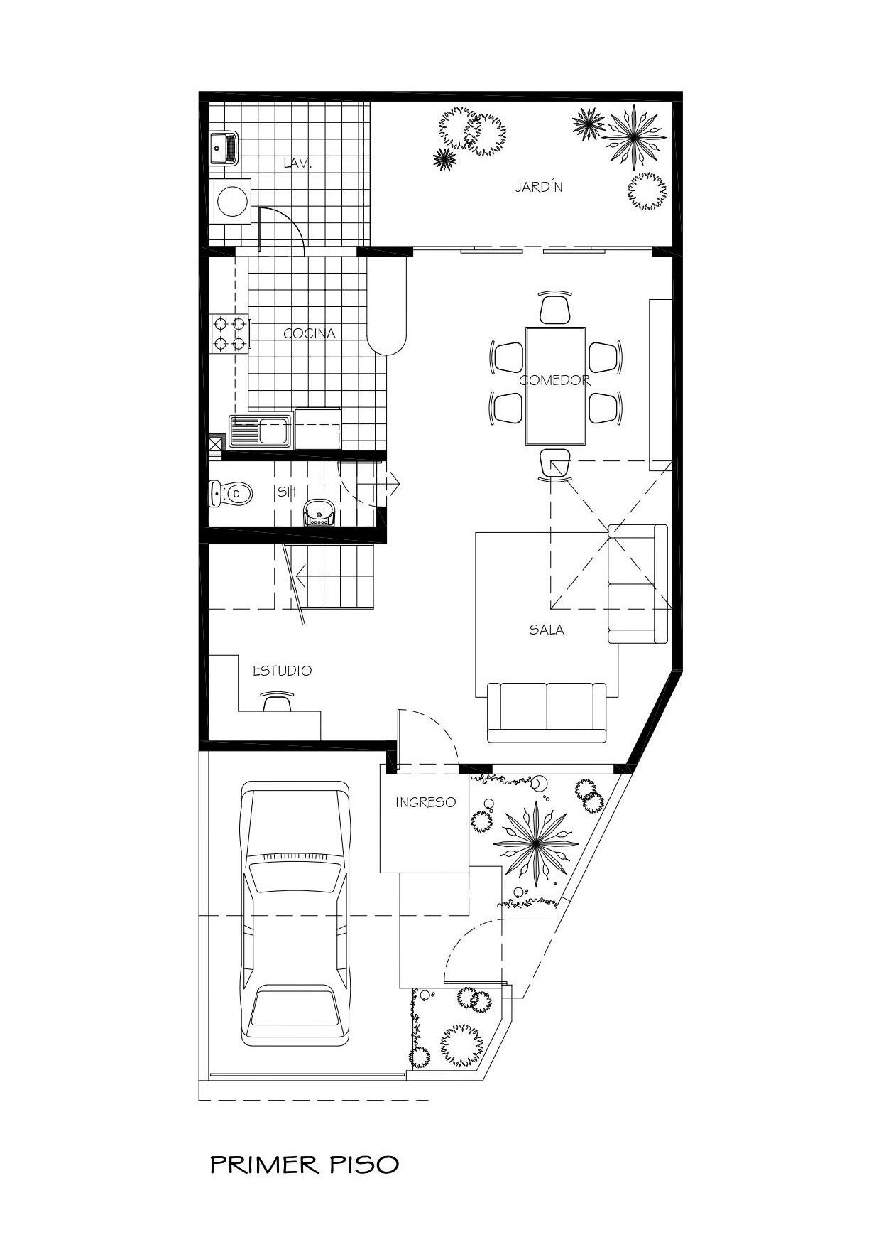 Se presentaron 3 propuestas en las que se incluyeron, además de lo solicitado: jardín delantero, doble altura en sala/comedor, kitchenette y un pequeño estudio.