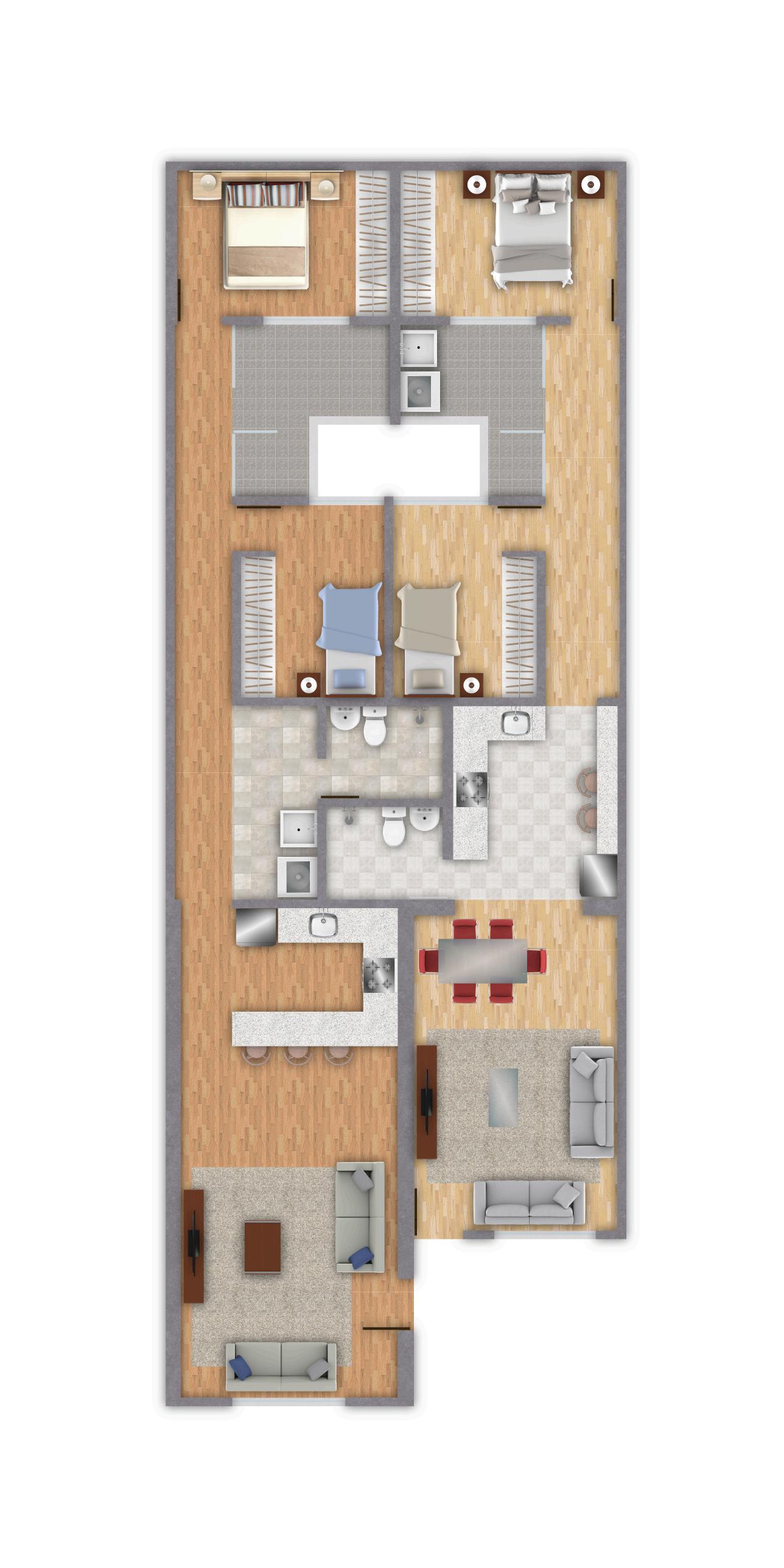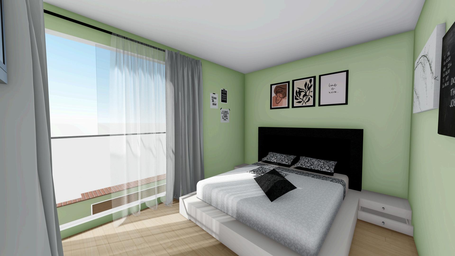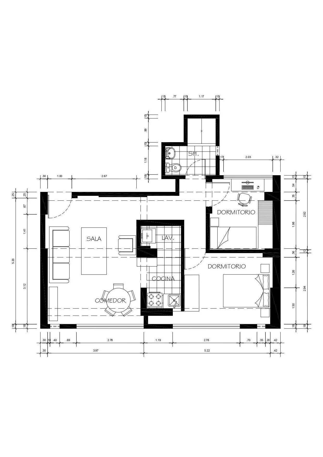 Para el siguiente proyecto se tenía una construcción existente de un departamento. El cliente solicitó una propuesta de distribución y diseño para su nueva vivienda. Se presentó dos opciones, la escogida por el cliente fue la siguiente.