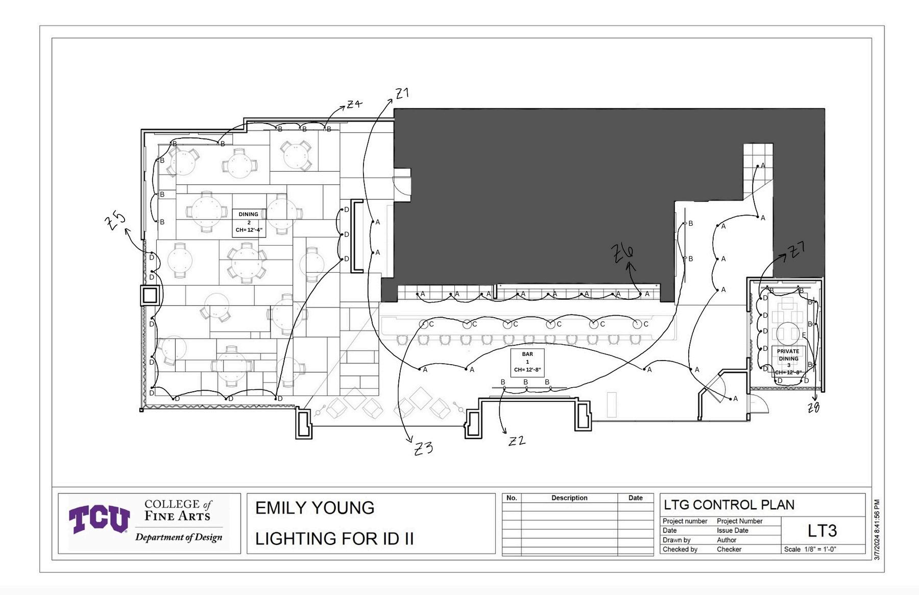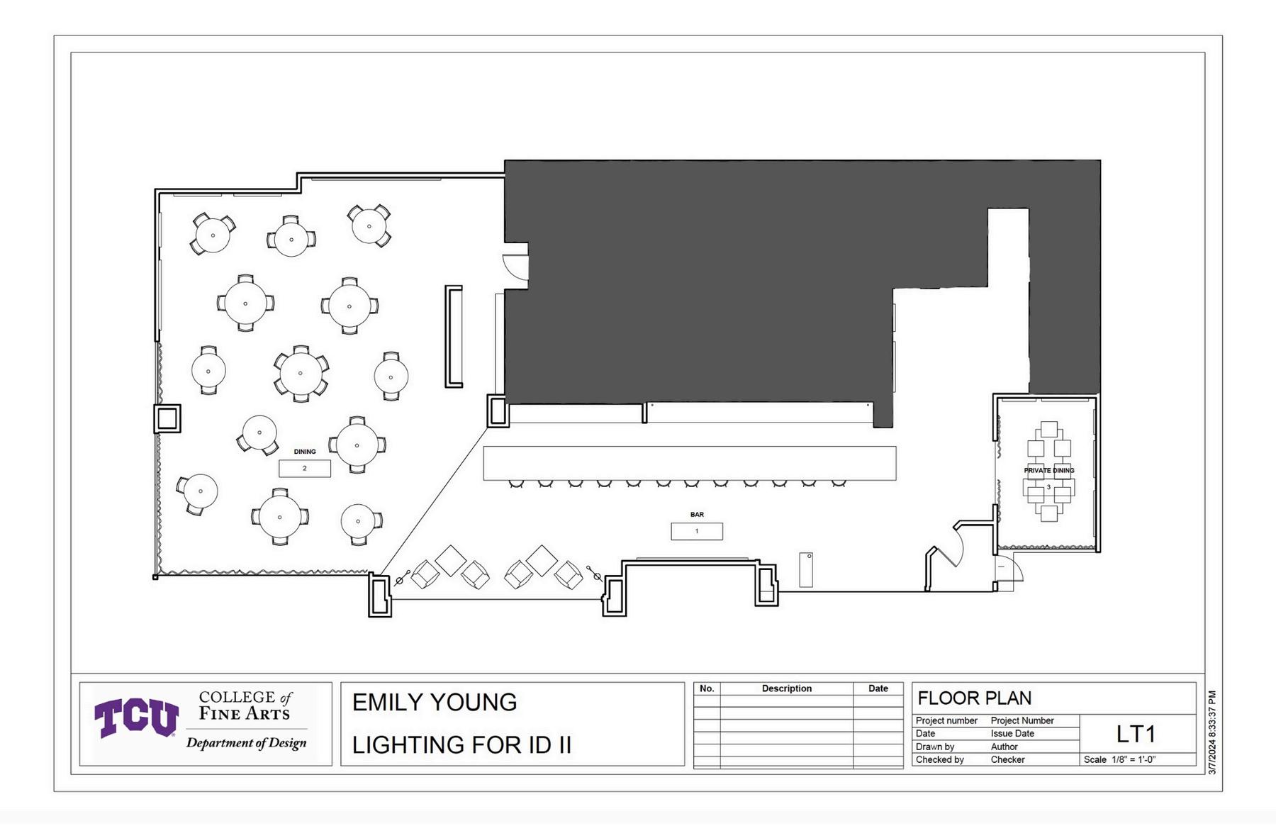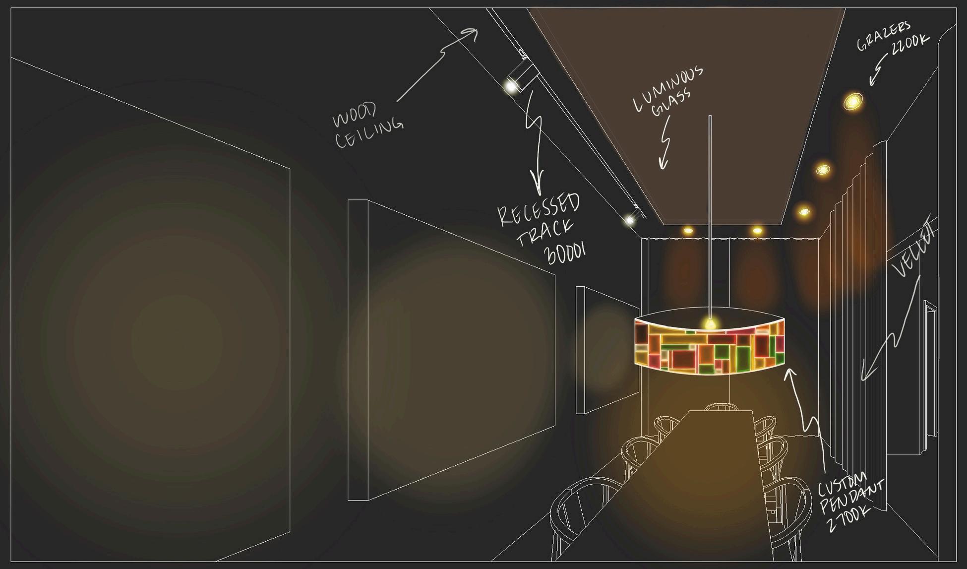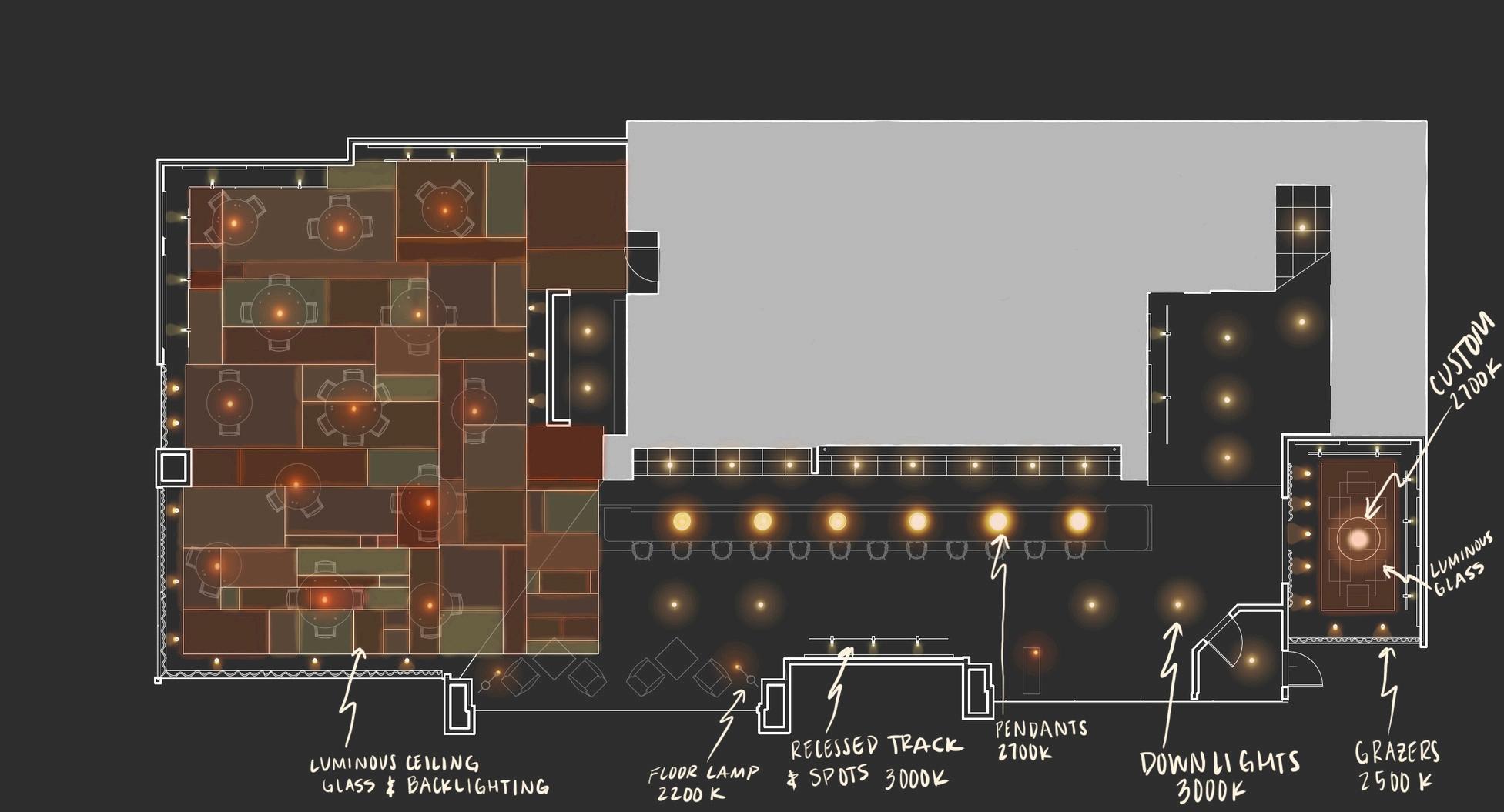 T A B L E O F C O N T E N T S 1 CONCEPT 2 PRECEDENTS 3 FLOOR PLAN 4 REFLECTED CEILING PLAN 5 RENDERED LIGHTING PLAN 6 LIGHTING CONTROL PLAN 7 CUTSHEETS 8 FIXTURE SCHEDULE 9 FIXTURE PRECEDENTS 10 PROCESS SKETCHES V.1 11 PROCESS SKETCHES V.2 12 PROCESS SKETCHES V.3 13 PROTOTYPING 14 FIXTURE DRAWINGS 15 DIGITAL MODELING 16 MAIN DINING 17 MAIN DINING 18 BAR SEATING 19 PRIVATE DINING 20 BAR 21 BAR 22 CIRCULATION