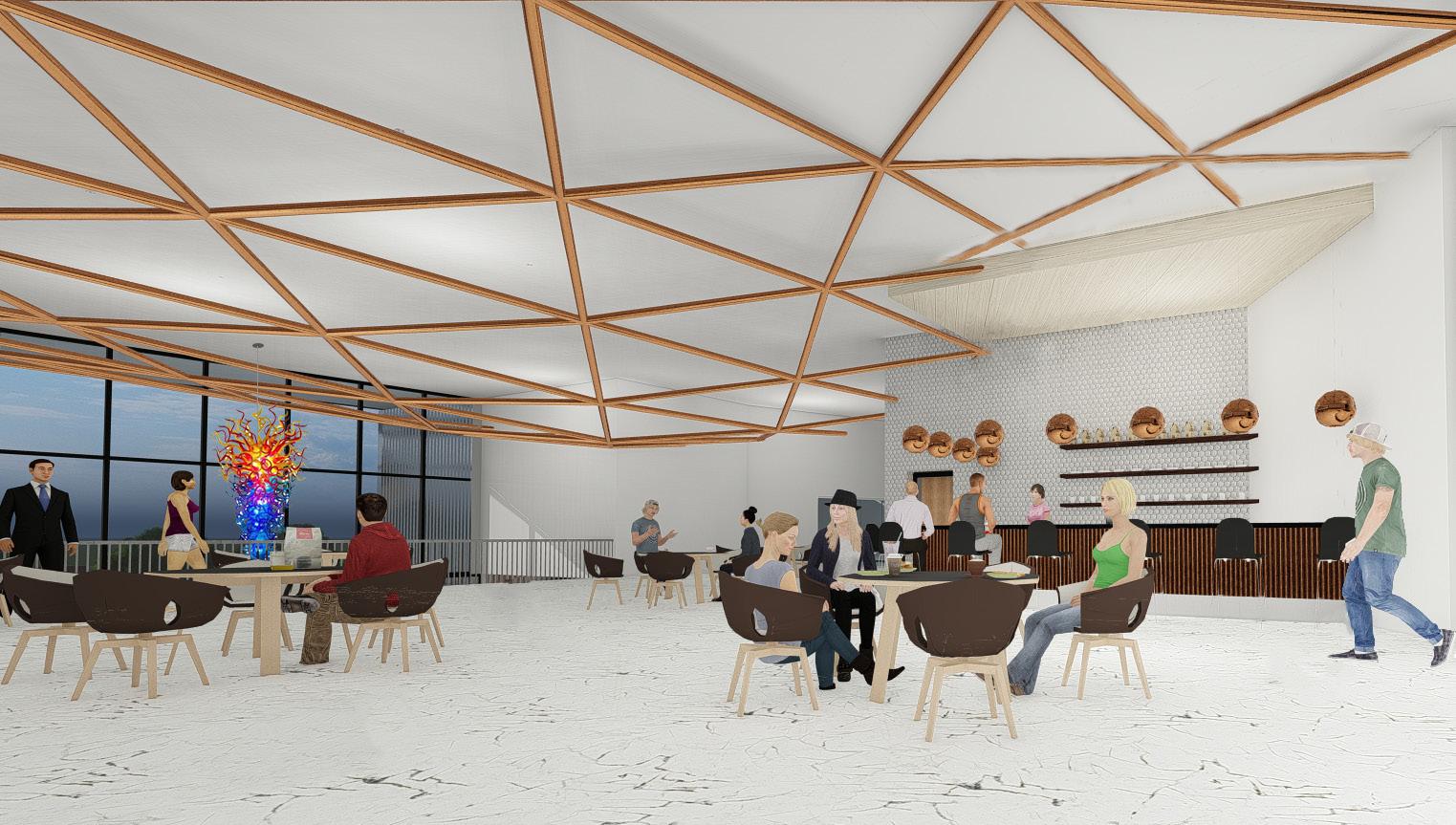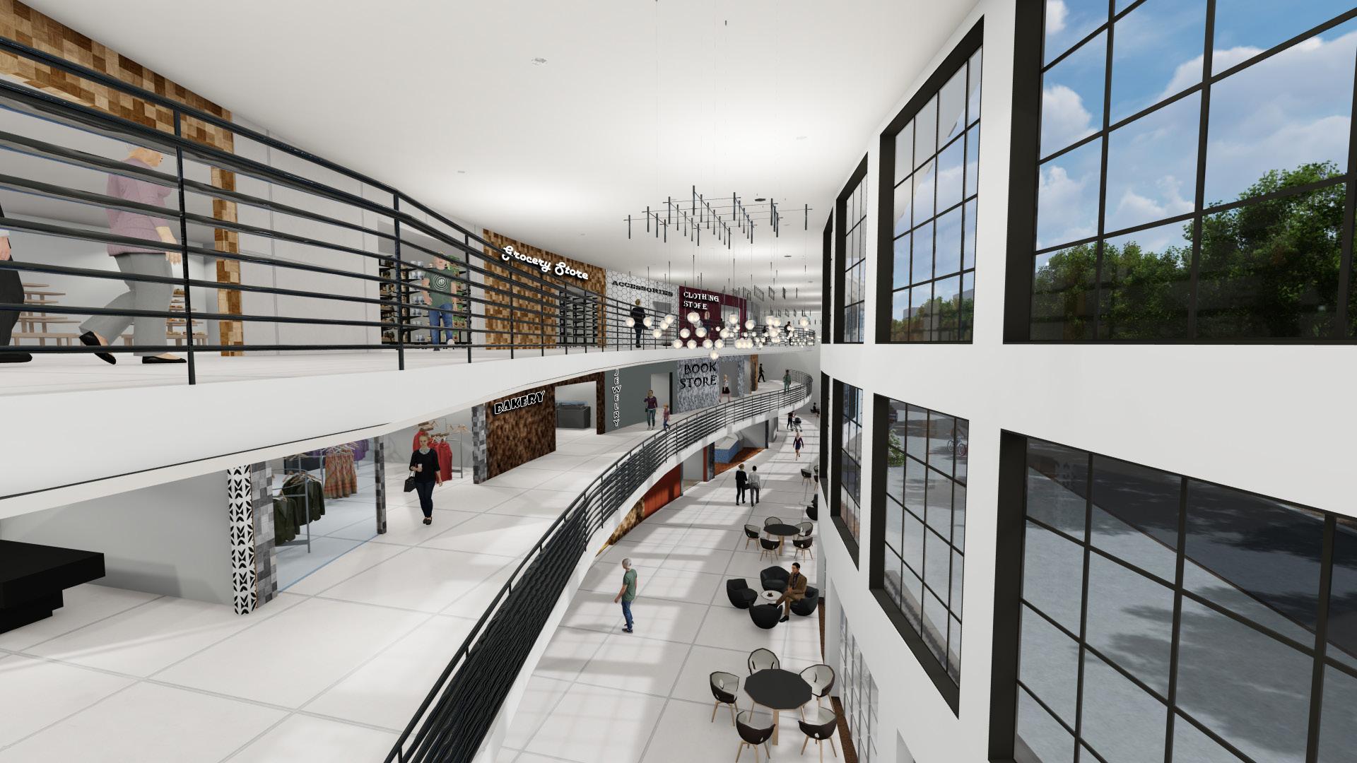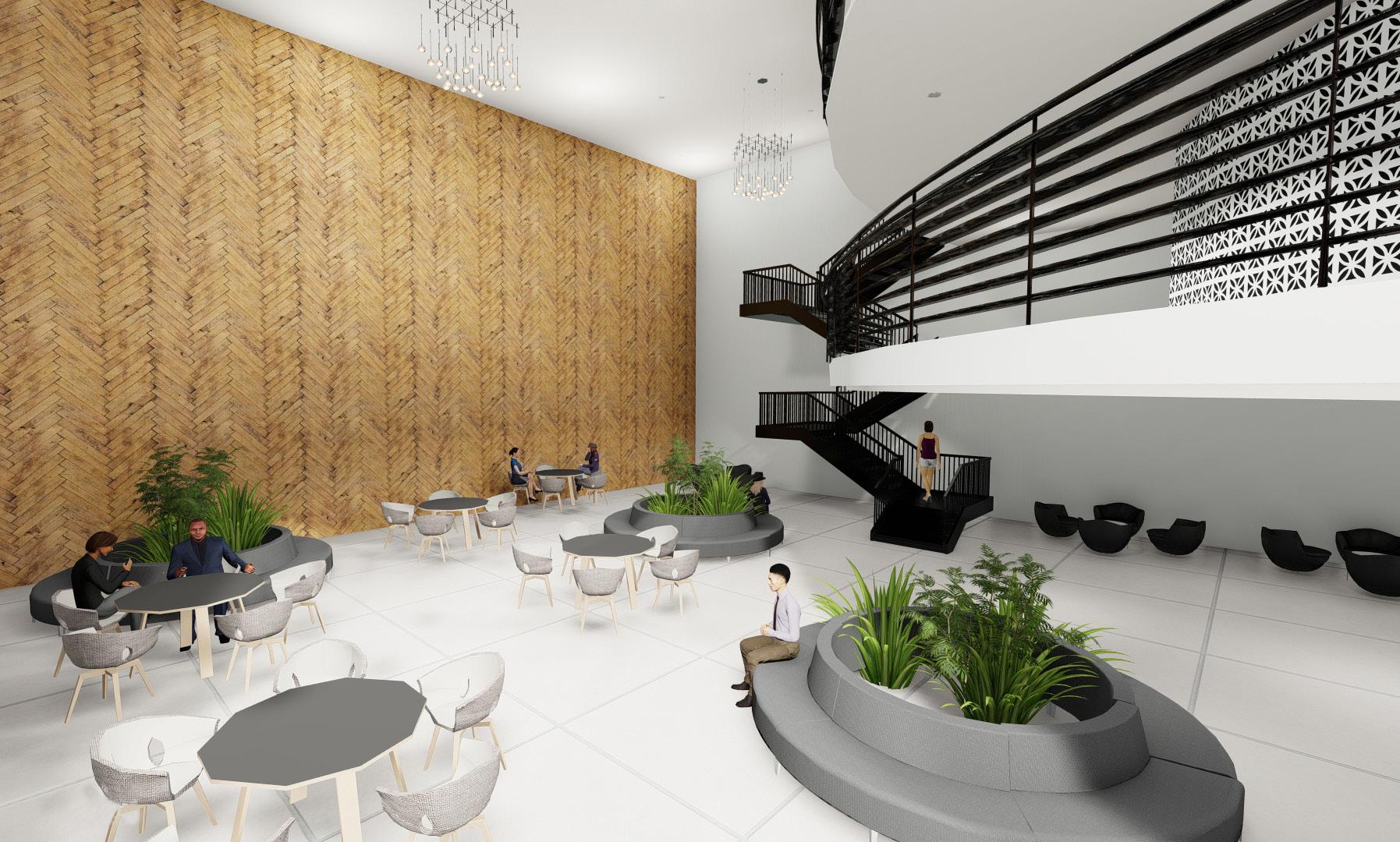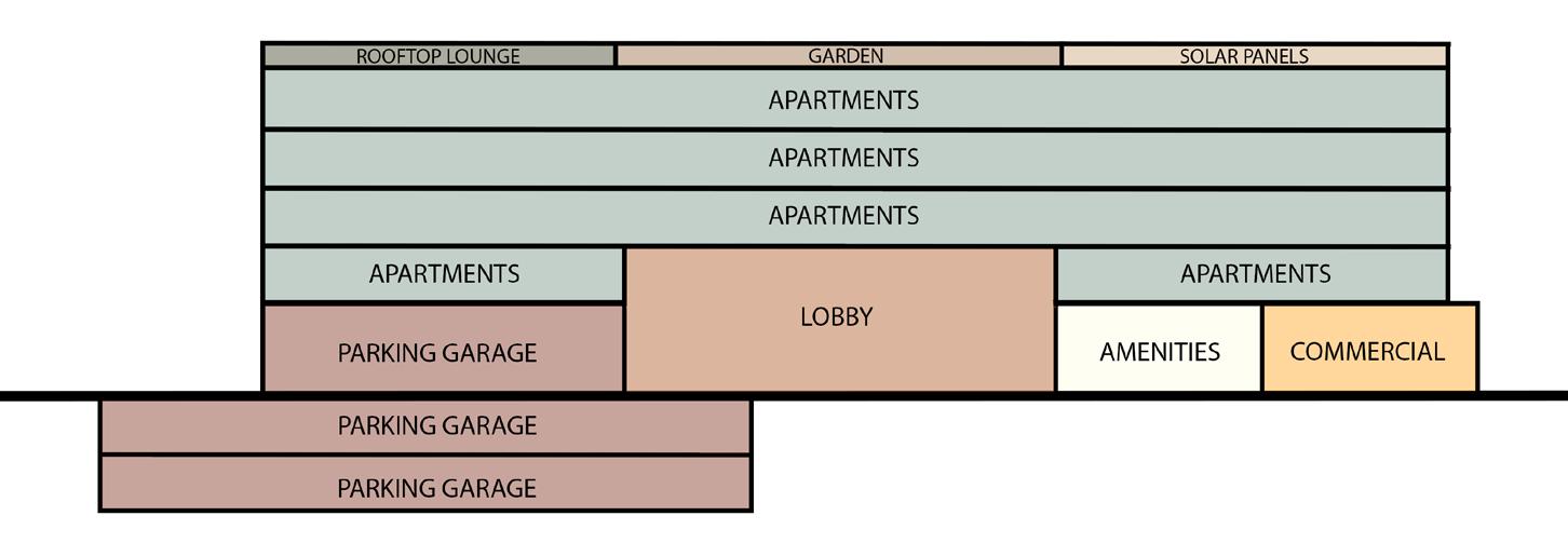 The first floor has contains spaces for stores or restaurants, as well as amenities for residents, such as a cardio gym, weightlifting gym, large work from home area with individual rooms, bathrooms, and management offices.