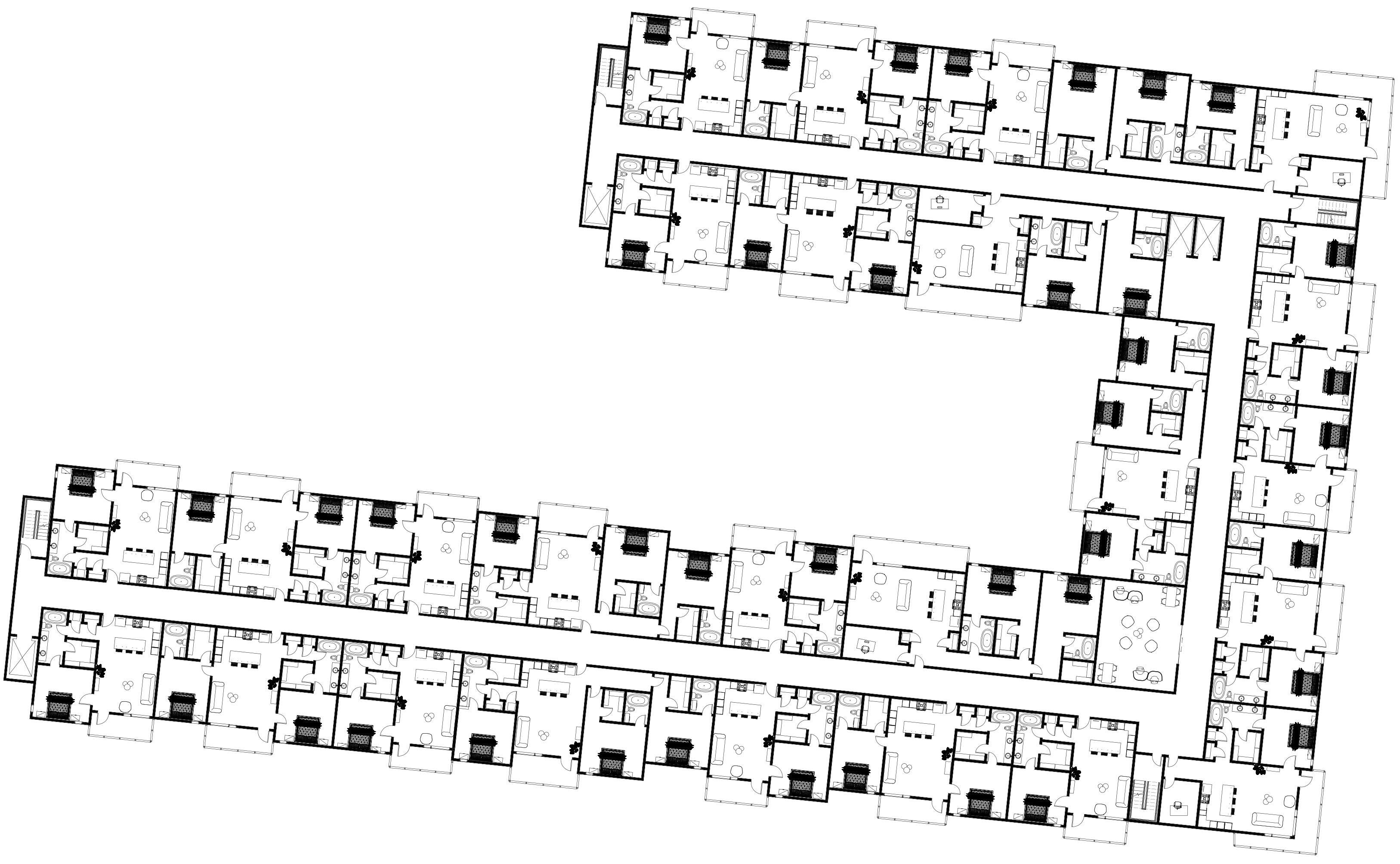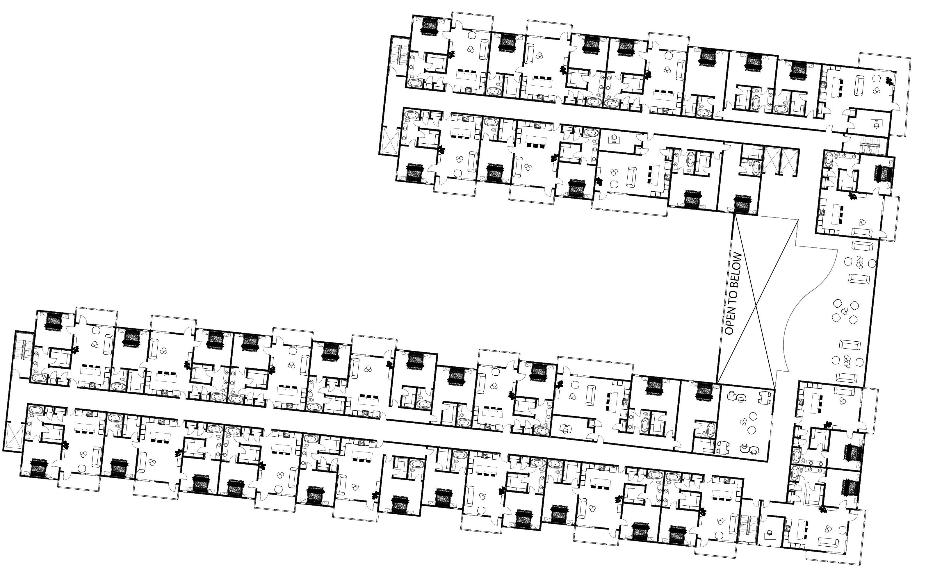 The second floor has a seating area that overlooks the lobby below, which also has views to the courtyard outside. Each floor also has an area for residents to be able to work from home if they do not want to work inside their apartment.