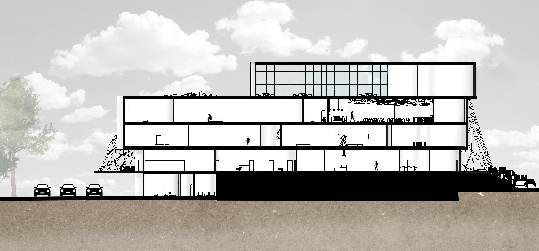 The majority of the building sits above the 100-year flood level to insure that the art and offices stay safe should a 100-year flood ever occur.