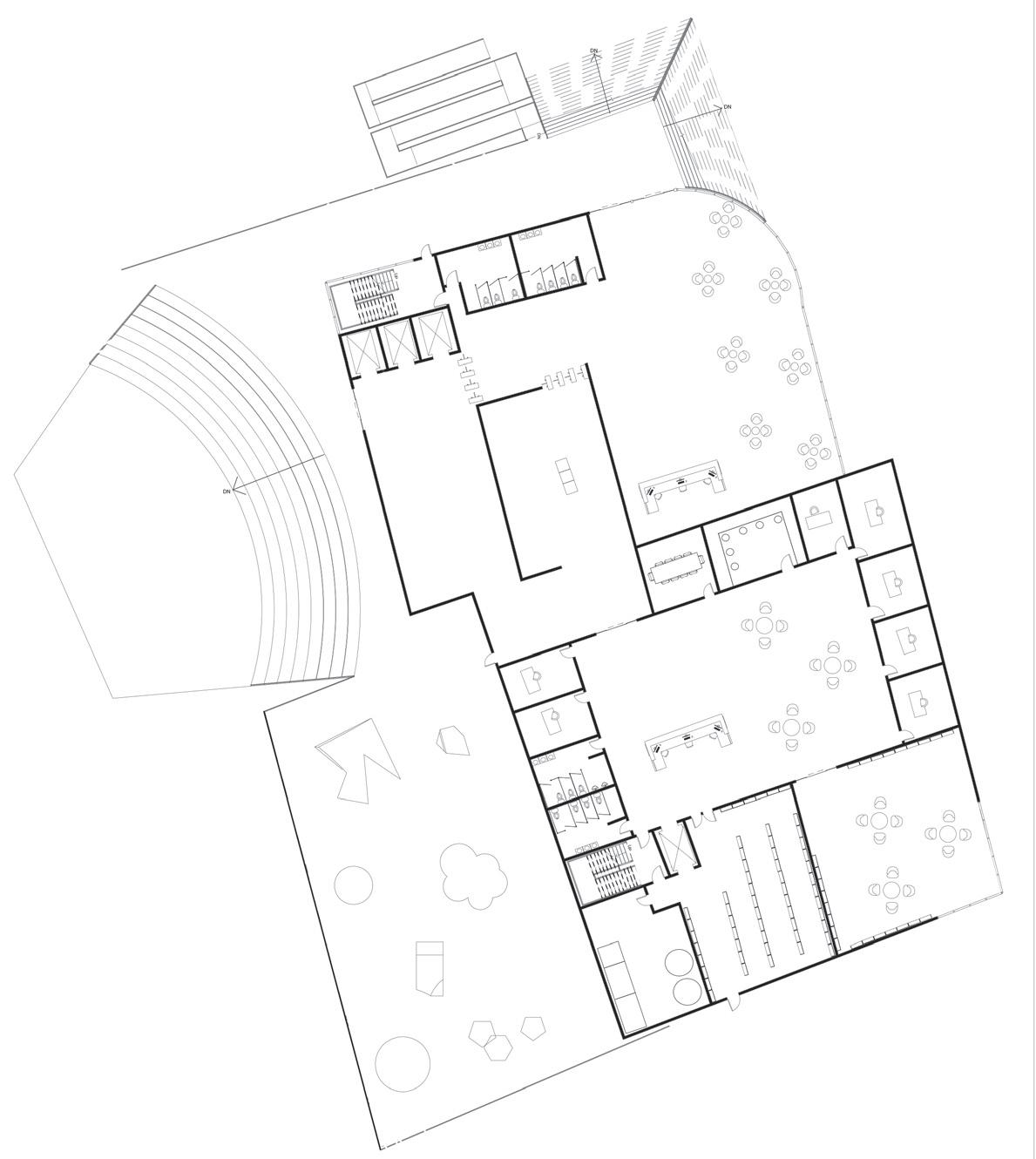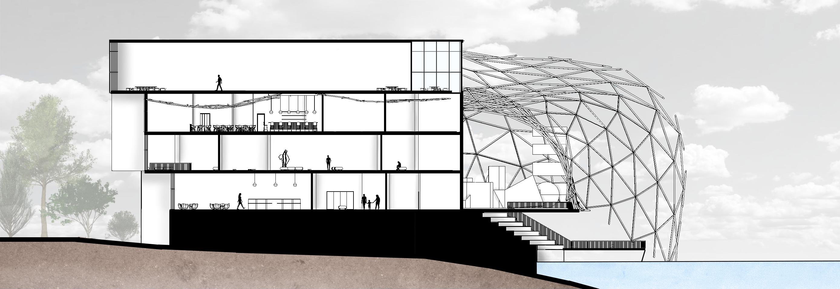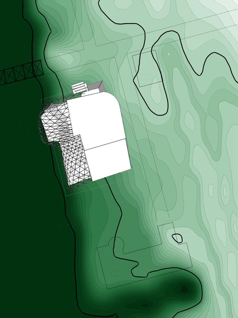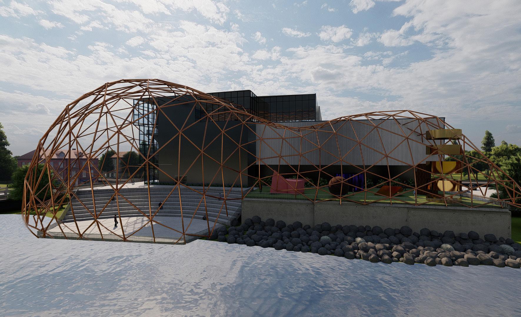 The design features an outdoor sculture garden, as well as an ampitheater. Both face the Delaware River and the town of New Hope, Pennsylvania. The triangles of the parametric form is an homage to triangular support system on the Lambertville - New Hope bridge, as well as the sailboats on the river that are a quintessential symbol of the northeastern United States.