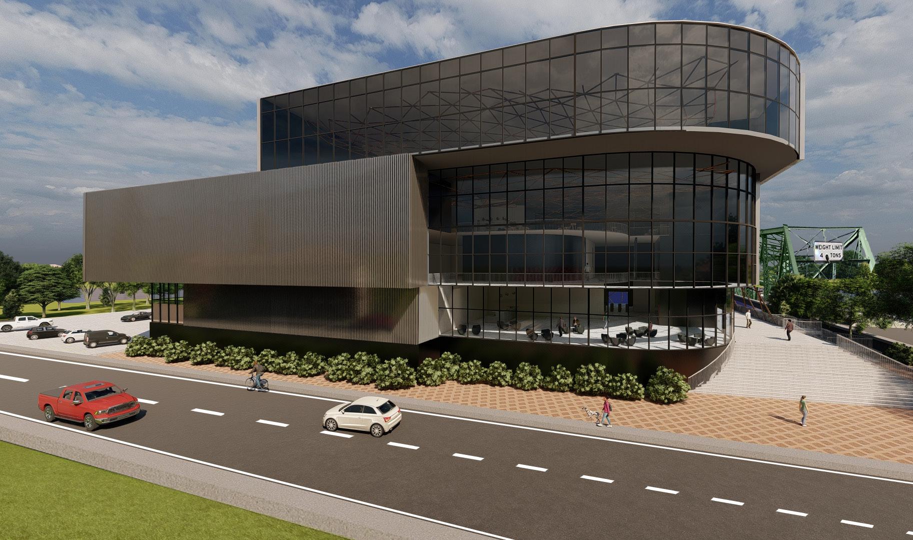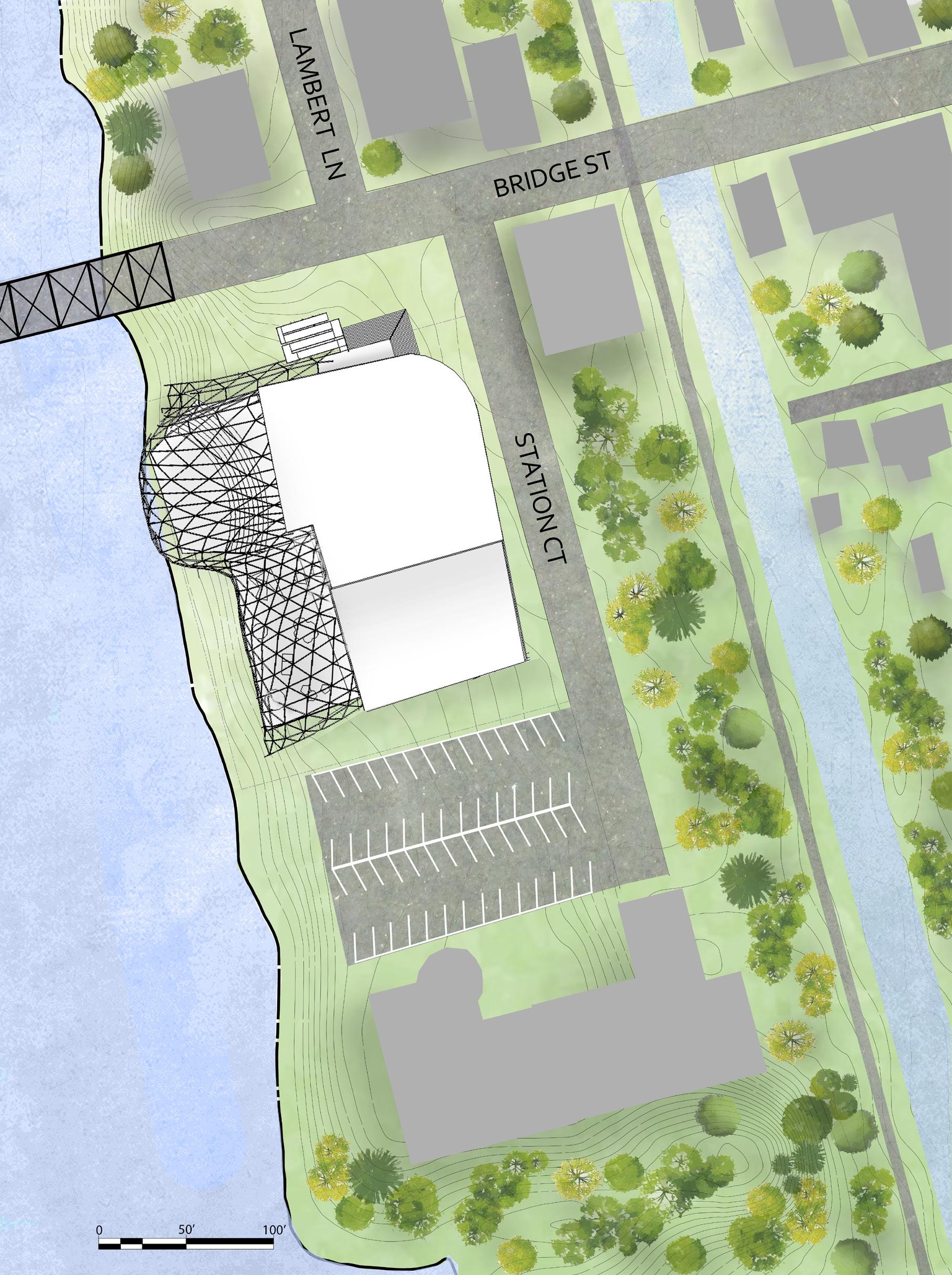 The site is located in Lambertville, New Jersey. It is on what is currently a parking lot on the Delaware River waterfront. Next to the site is the Lambertville-New Hope Bridge, which links the towns of Lambertville, New Jersey and New Hope, Pennsylvania. It is both a pedestrian and vehicle bridge. The bridge generates plenty of vehicle and pedestrian traffic. The main focus and concept of the project is to provide a place for artists to showcase their work. I wanted to incorporate the history of the town into the use of materials that were common during the early days of the town, including iron and steel.
