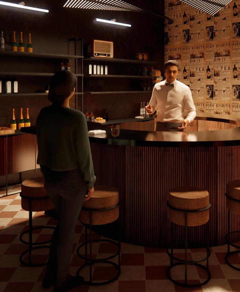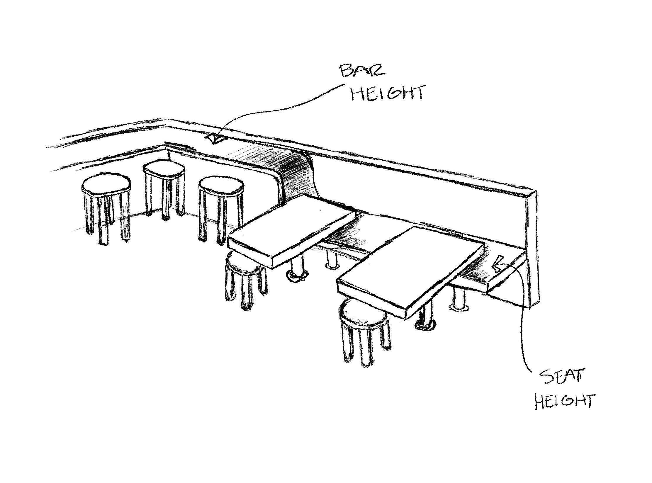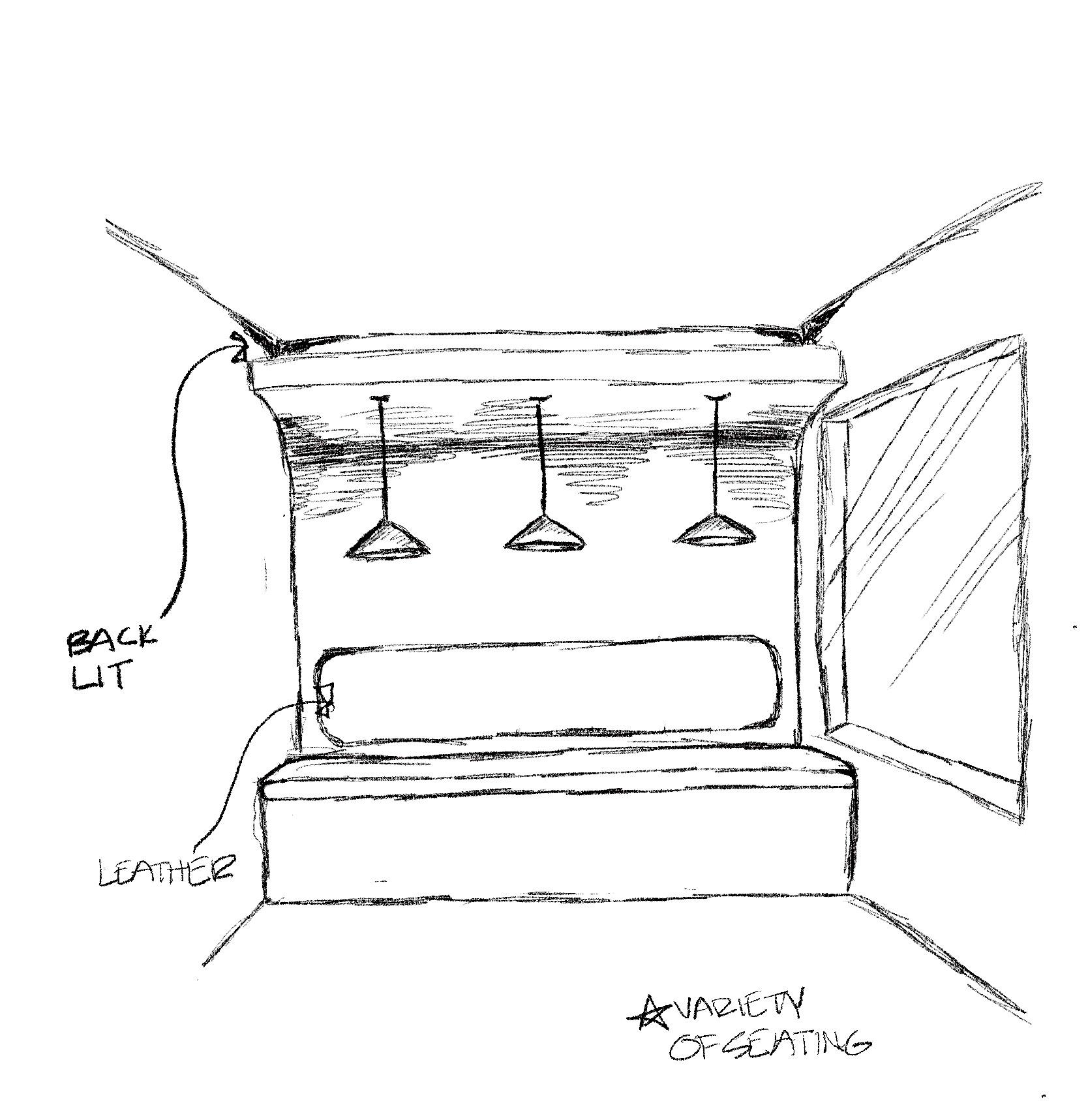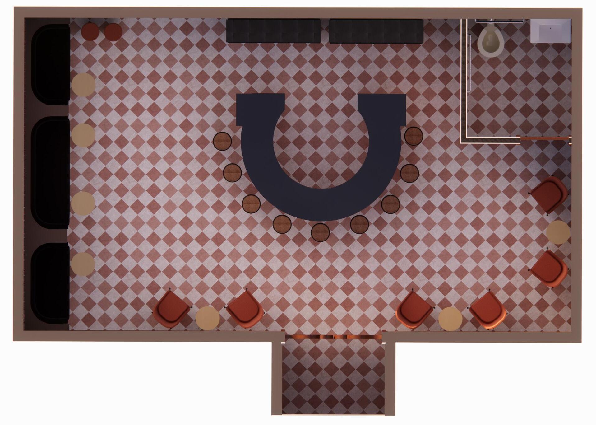The overall design of the speakeasy must function in the same capacity as a full size bar while not feeling overcrowded. This is accomplished by a large, central bar with ample seating.