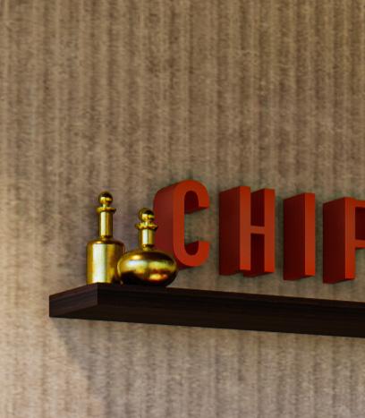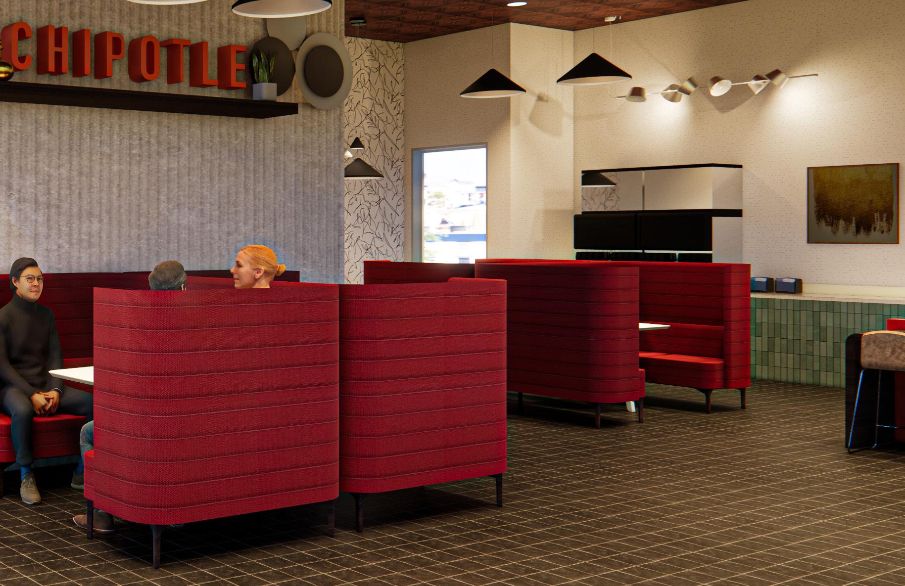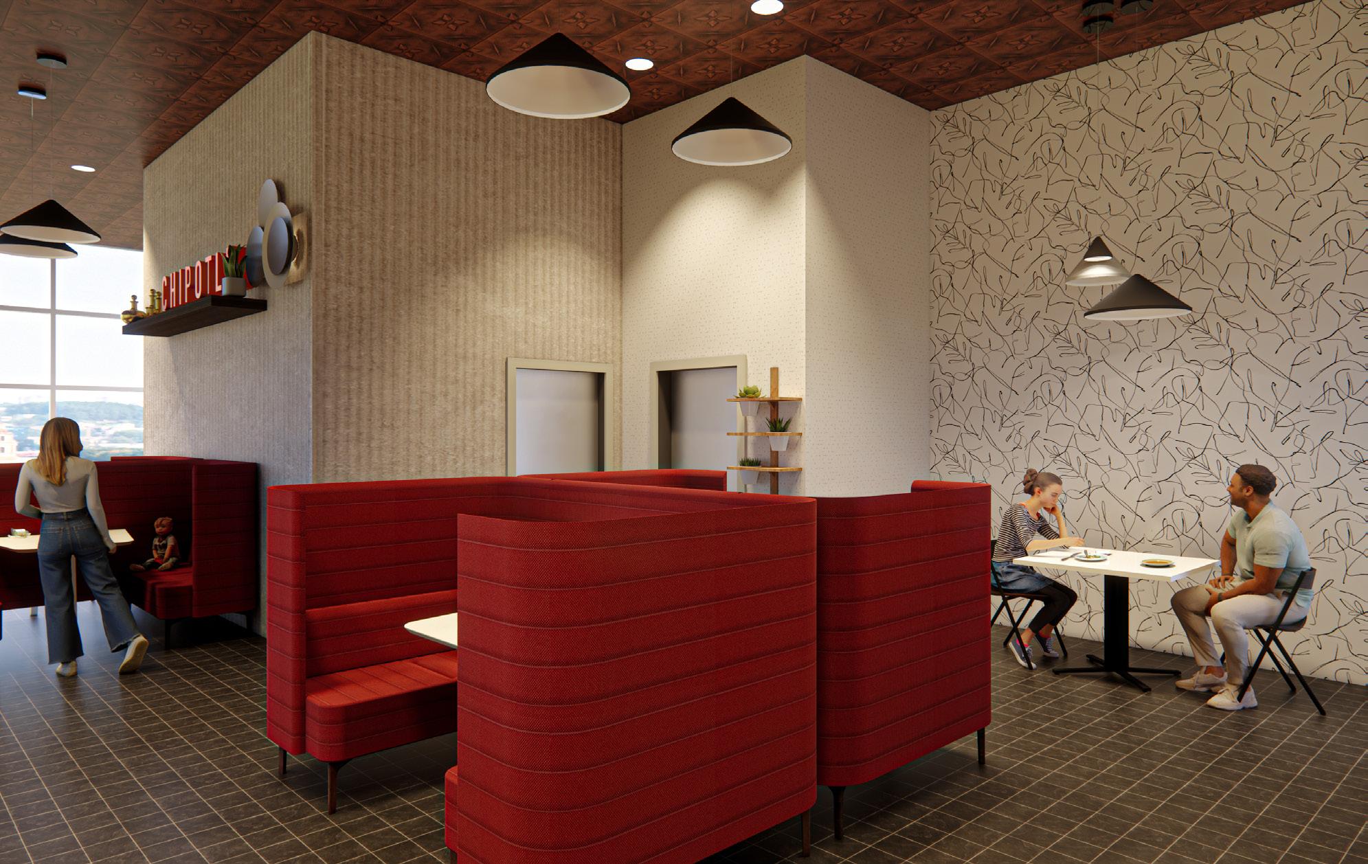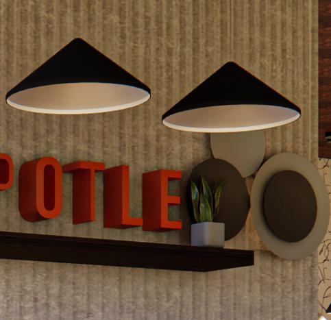 - The cement wall features a large copper “Chipotle” sign and a unique light fixture to visually ground the light colored walls.