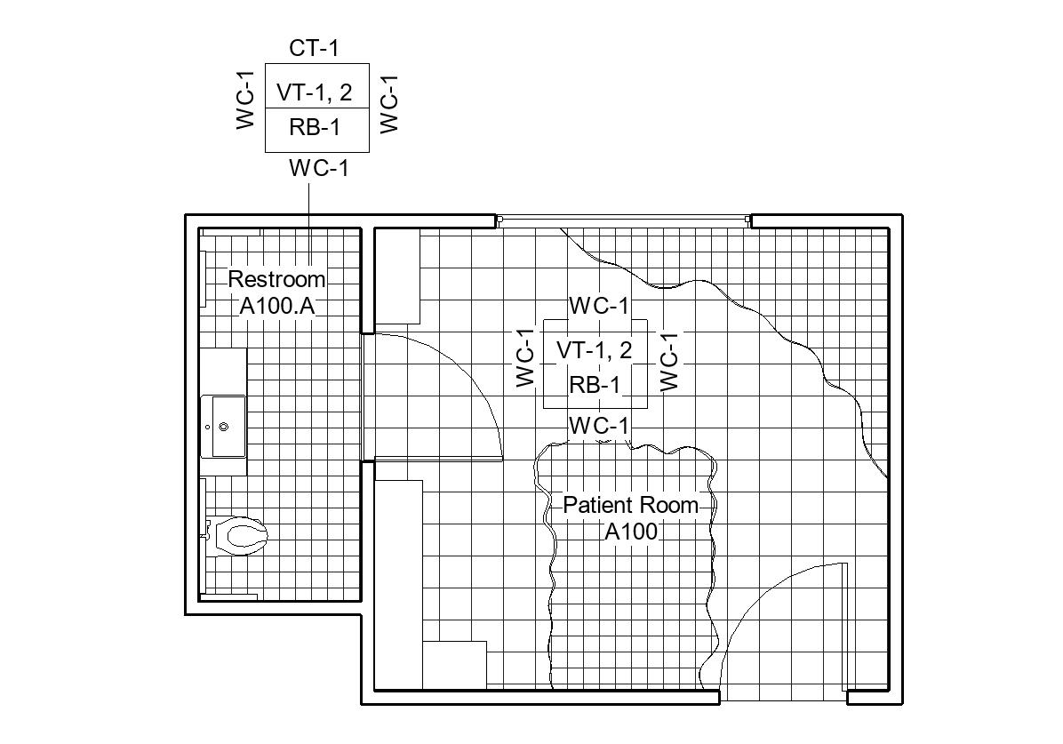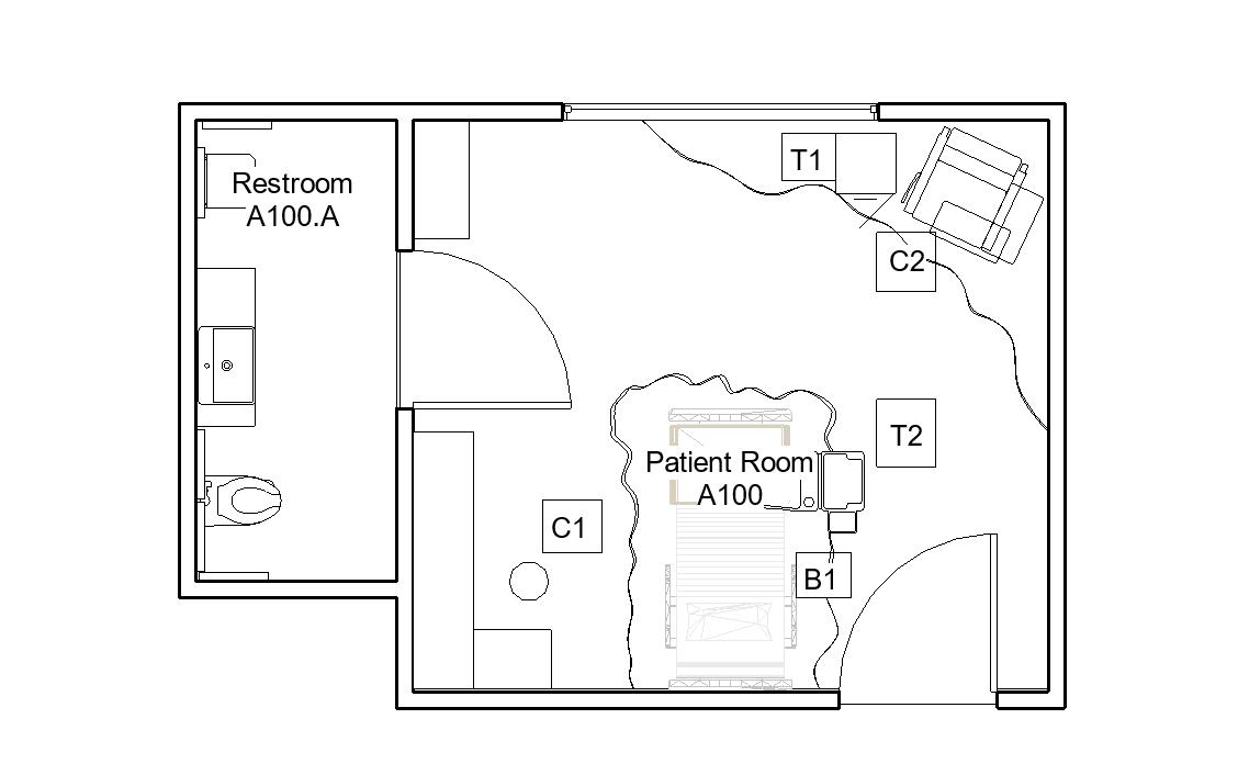 Use an existing floorplan to create a hospital patient room that meets the standard ADA requirements and needs of a cancer patient.