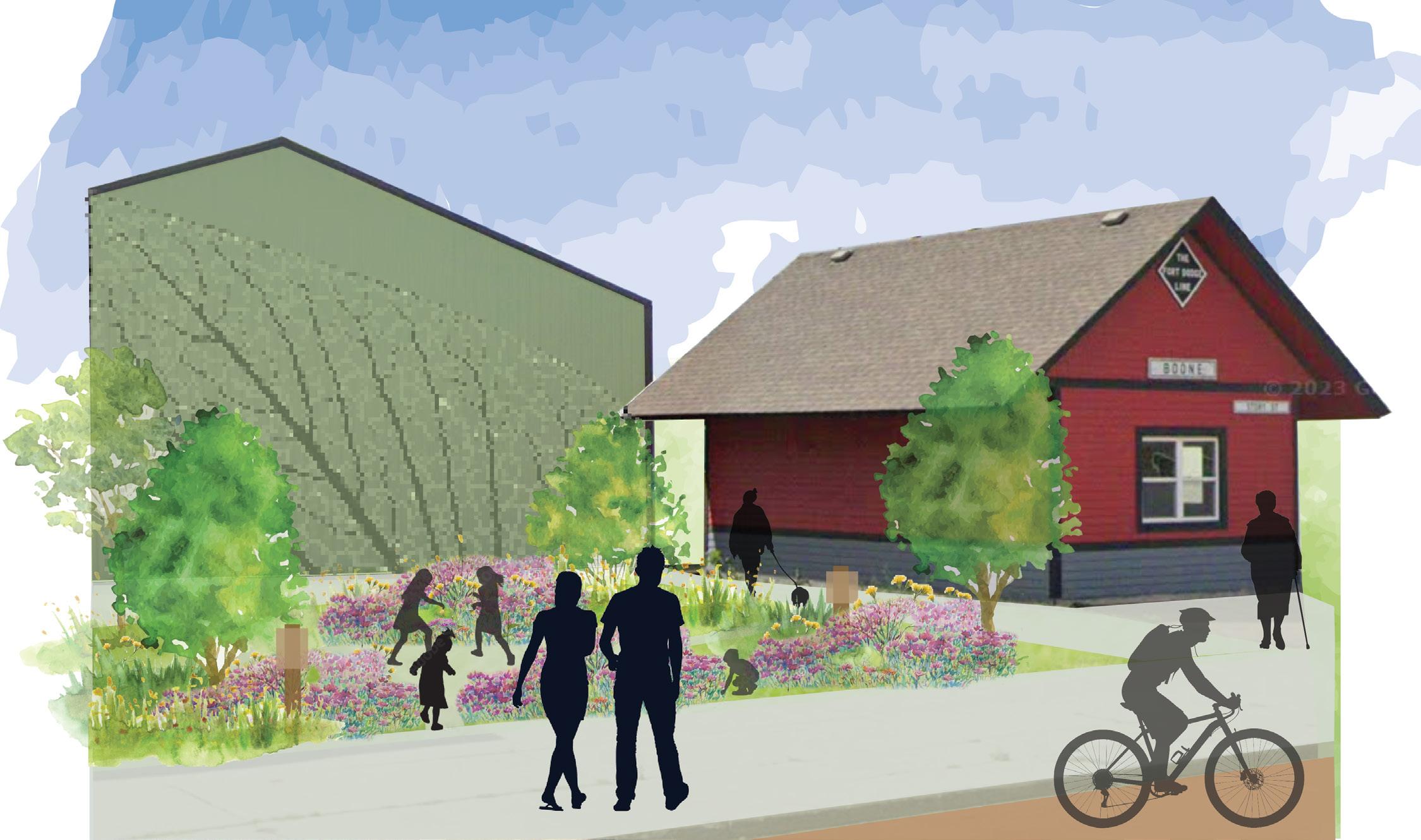 legend pedestrian vehicular building locations recreation tree canopy arts corridor trolley/train stops play areas plantngs community event spaces trolley line alley way pollinator garden picnic spaces entry nodes landmarks 1 3 4 5 6 7 8 9 10 11 recreation areas pollinator garden nature playscape multi-use event plaza parking entry plaza garden urban farming windbreak open lawn tama st. marshall st. rain garden plaza sculpture garden boone history plaza food truck/ vendor parking picnic storybook garden multi-use plaza multi-use plaza tina’s outdoor seating public arts corridor garden story st. 11th st. 10th st. tree canopy green corridor