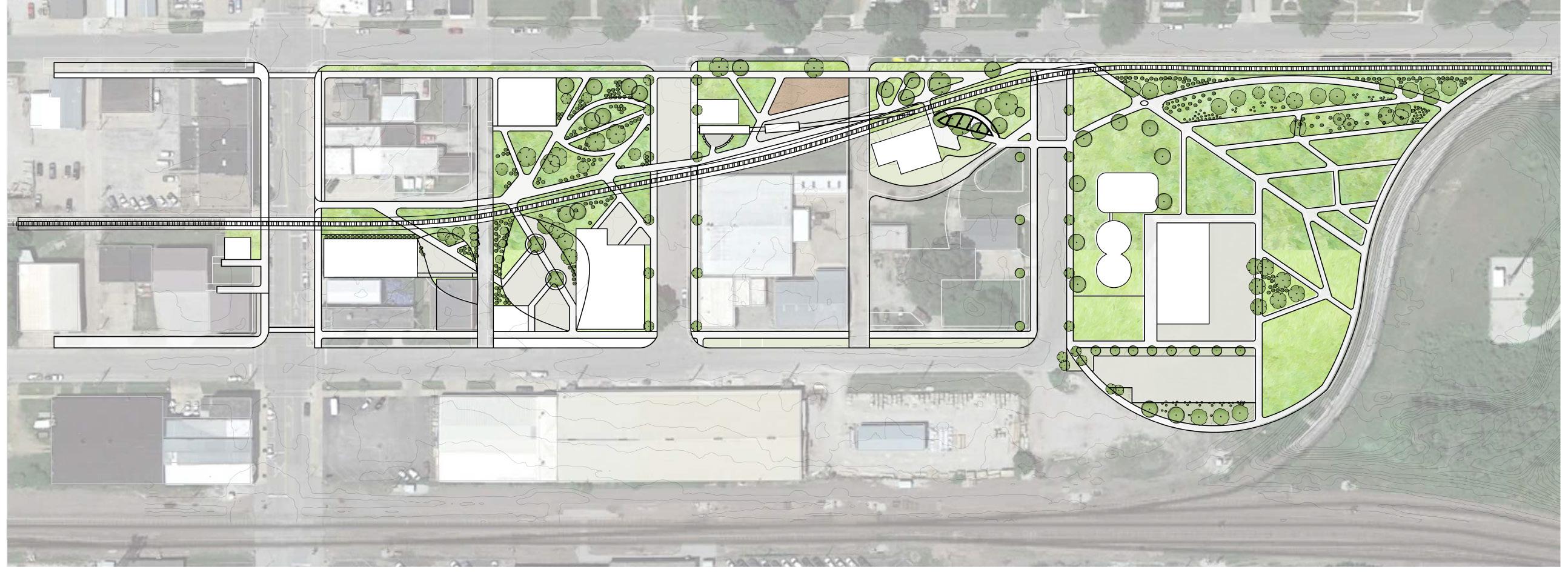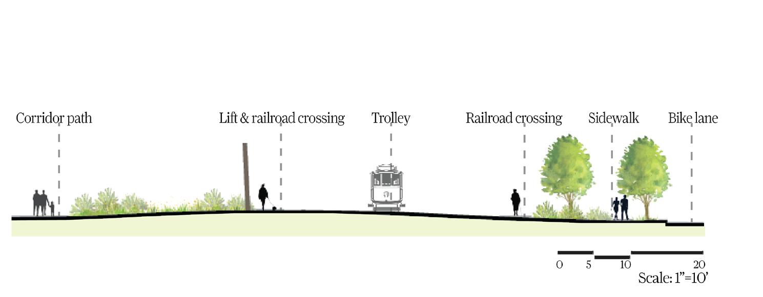 Section 2: Highlighting the ReVamp Cafe to the Leafbook Garden with connections across the trolley line.