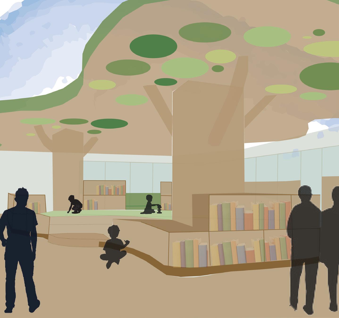 Within the Leafbook library, there is a children’s nature-themed library, community art classrooms, and a community center. Within the outdoor space, there are several opportunities for growth and education. The leafbook library opens out onto the outdoor classroom and the storybook loop. The storybook loop can be customized to fit the season or a different education tool. The school across from the site allows children to access the site directly.