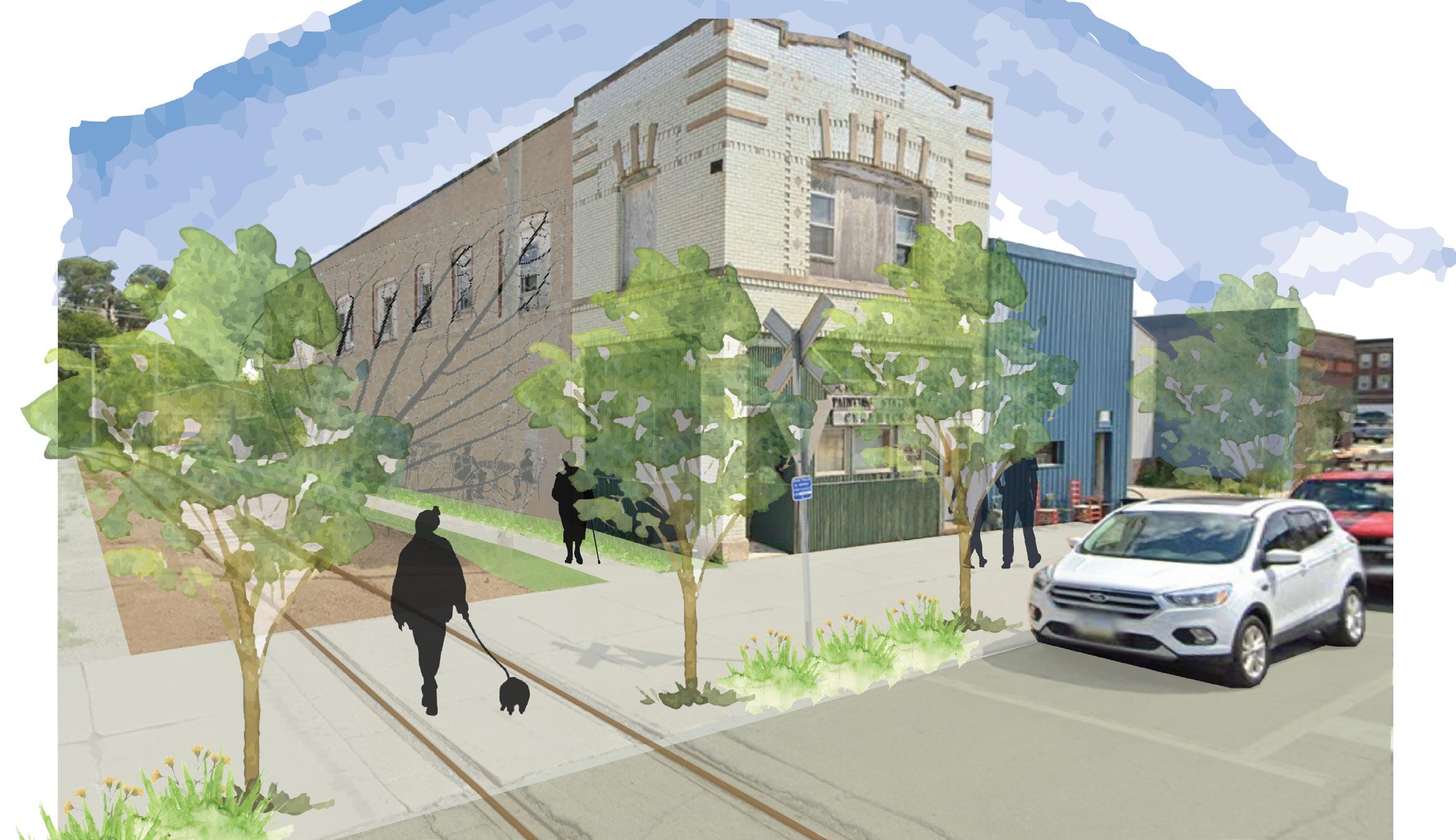 Section 3: Marshall Street sidewalk to the ReVamp Cafe with bike lanes and a vegetation buffer.