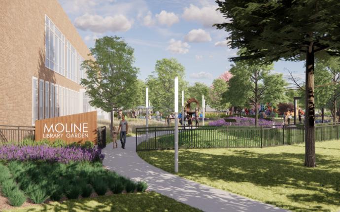 Section 1: The connection between the Leafbook library and Marshall Street with a children’s play area and bioswale.
