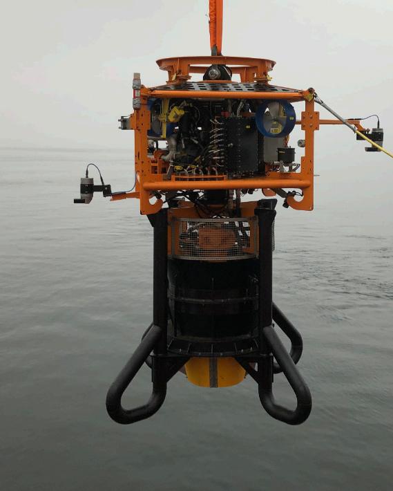 Kraken Robotics Acoustic Corer in it's deployed state and booms locked in place. The AC has three acoustic transducer Packages and hydrophones per boom.