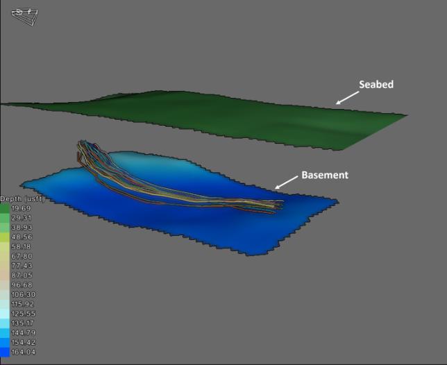 Results from a Kraken Robotics 3D Acoustic Corer survey mapping buried Conductors at depths of 140ft below the seabed. The AC was used to map the entire field, producing positions of buried infrastructure to support potential CCS and decommissioning
