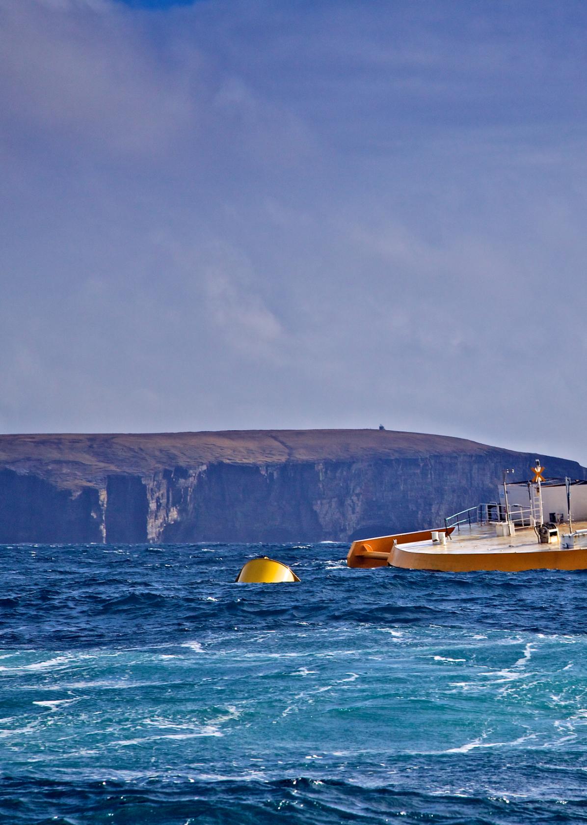 energy generated by the movement of its asymmetrically shaped hull, which rolls, heaves and pitches with each passing wave. This motion was used to accelerate and maintain the revolutions of a spinning flywheel housed inside the hull, which in turn drives an electric generator to produce electricity that is then exported via a subsea cable.