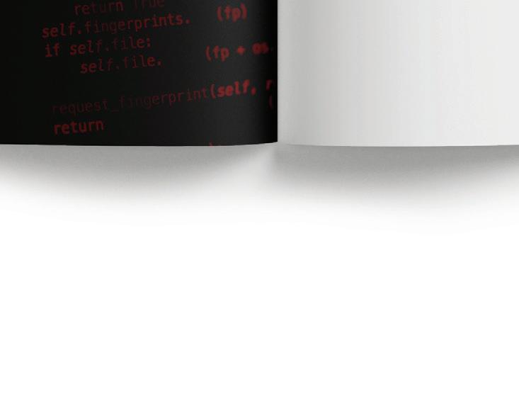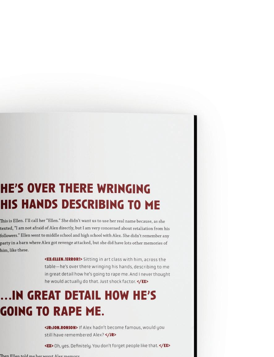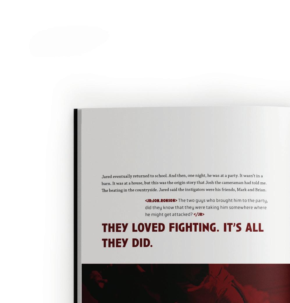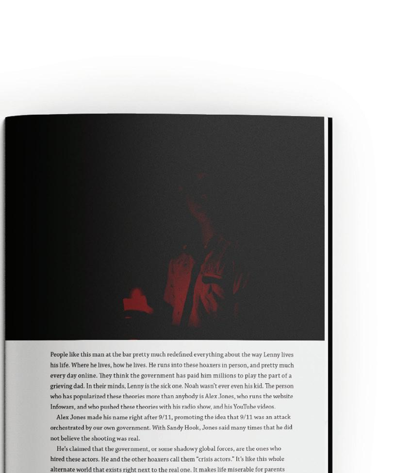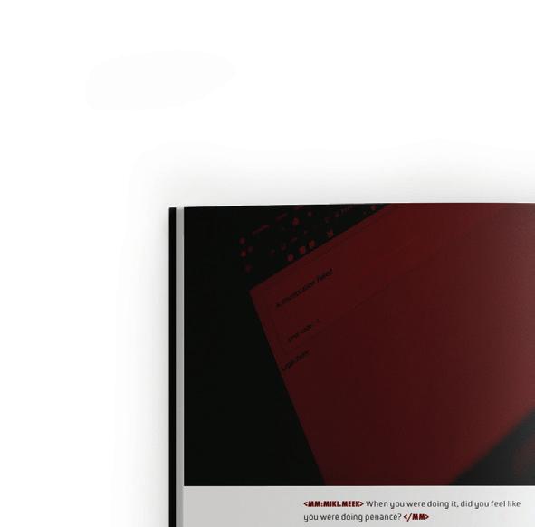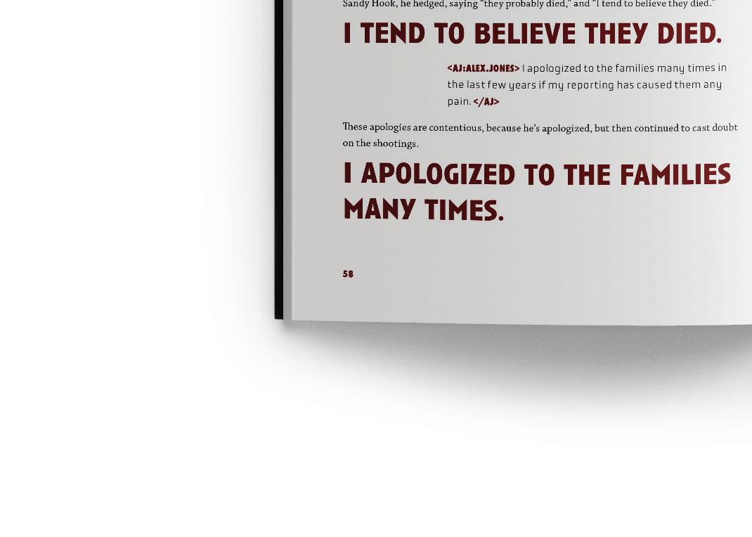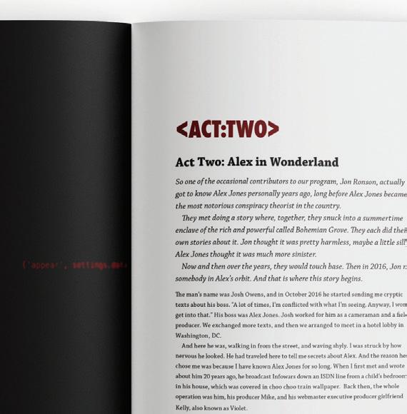 The visual system was inspired by computer programming language, using HTML tags to identify the speaker throughout the podcast transcript. The images were styled to appear as monochrome in a deep maroon color.