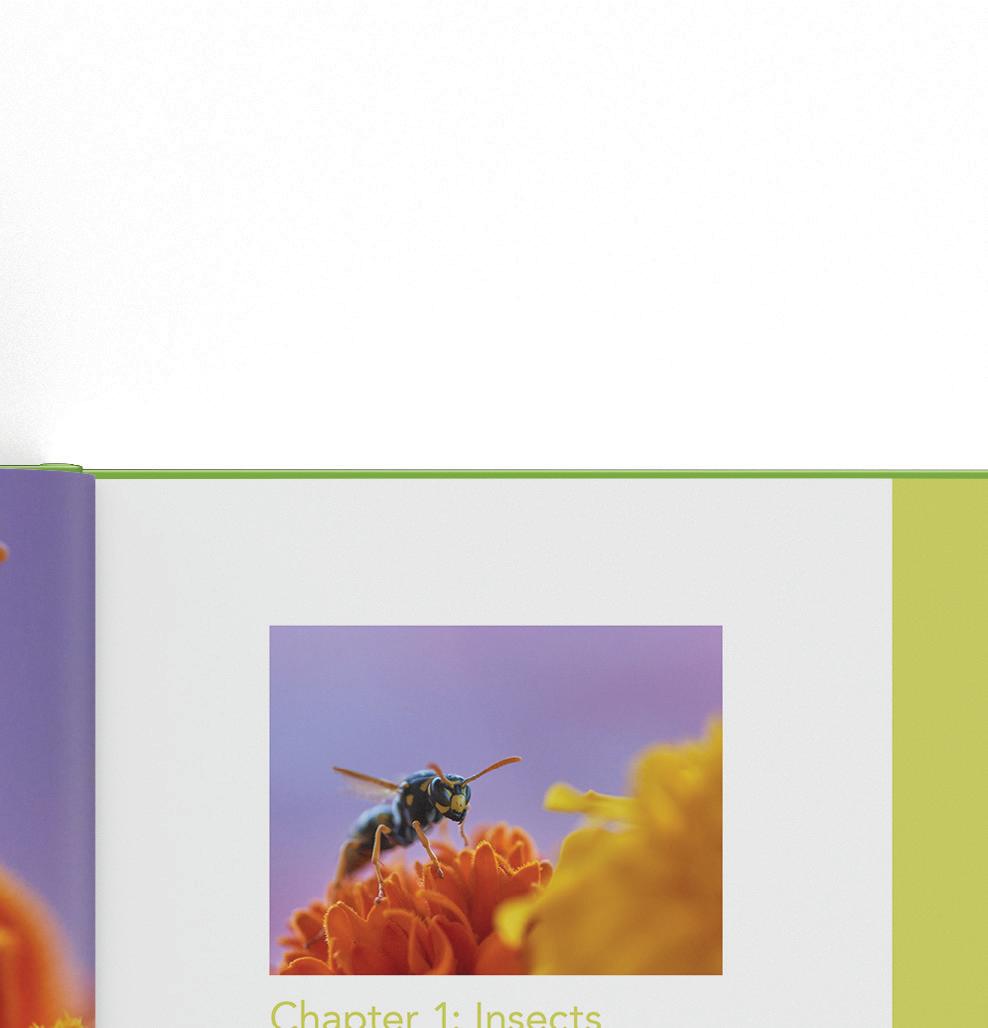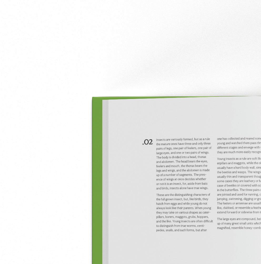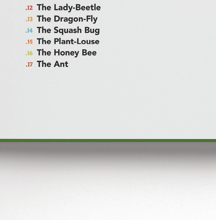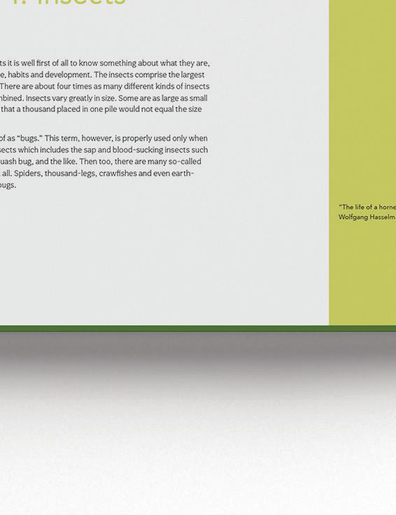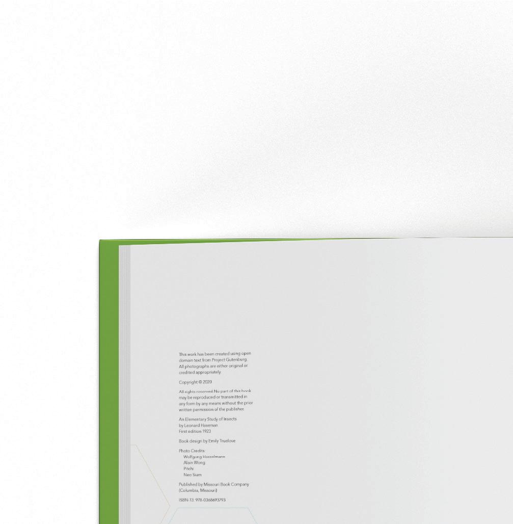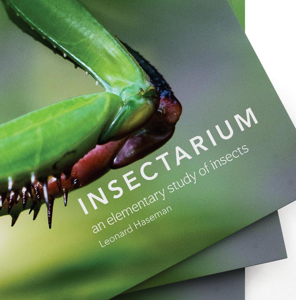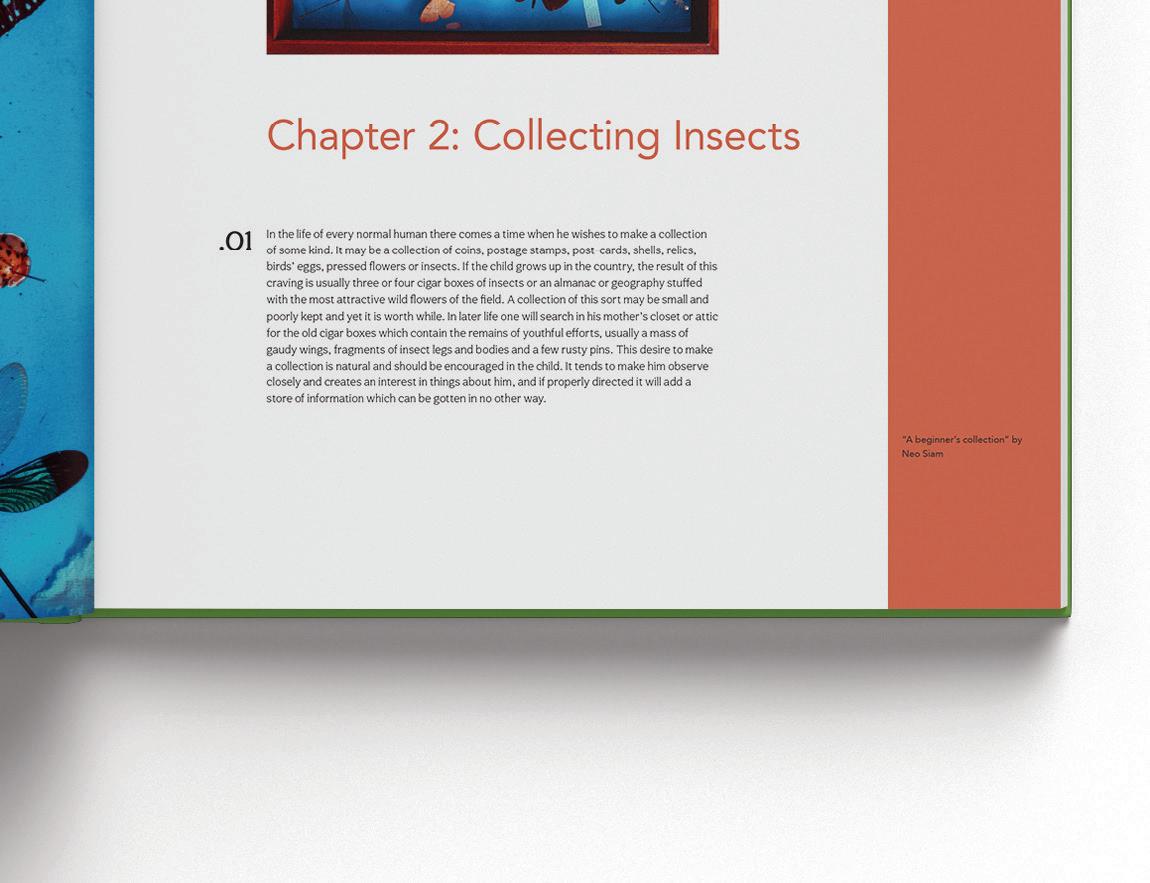 Insectarium uses the text from An Elementary Study of Insects by Leonard Haseman. The dense academic text was transformed by being paired with striking insect photographs. The images of the insects are extreme close-ups, making them appear larger than life. The vibrant color palette was derived from the insect imagery and used to visually differentiate each section of the book.