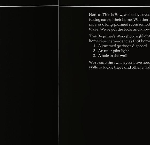 This Is How is a brand dedicated to making home repair skills and tools available to ordinary homeowners. The objective is to increase access to the skills and tools needed to complete basic home maintenance and respond to small household emergencies. The goal of the brand is to help homeowners learn how to perform common maintenance and repair tasks.