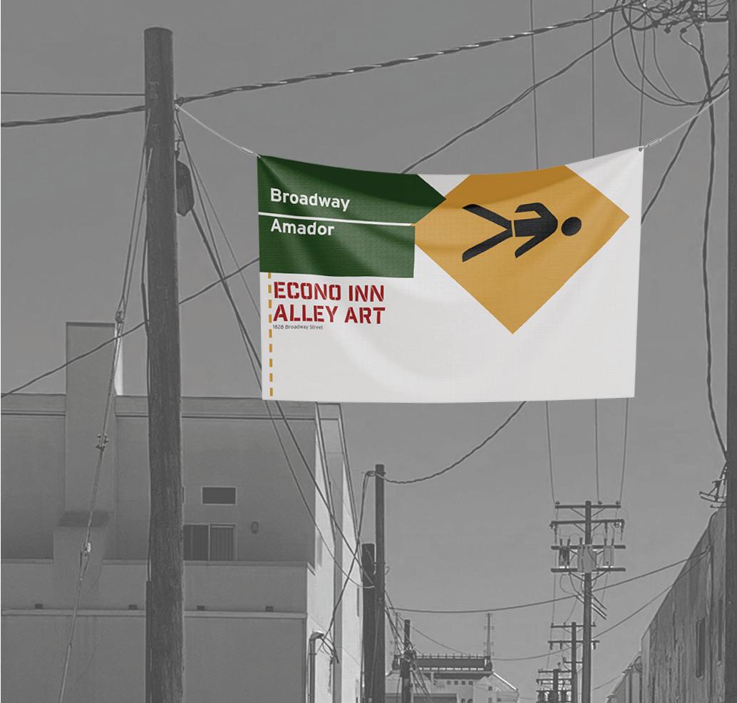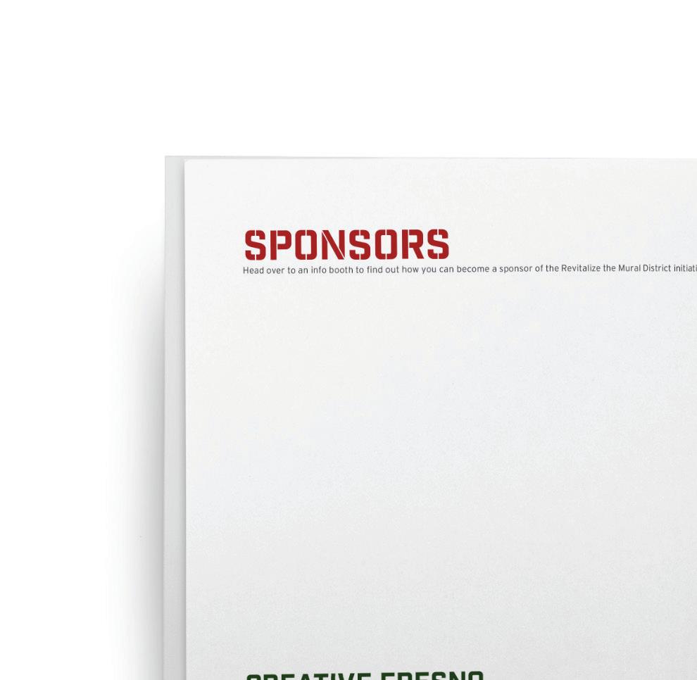 Revitalize the Mural District was envisioned as a nonprofit that worked to bring life to the district. An oversized booklet directed patrons around the area and provided information about each piece. Due to the substantial number of murals available, a specific artist was chosen to be featured at the event. The environmental designs were also intended to be oversized, with hanging banners that spanned the streets and directed people to even some of the most hidden murals. The app supplied much of the same informa tion as the gallery guide, but also featured Augmented Reality capabilities that allowed patrons to take photographs of themselves enveloped within the artwork.