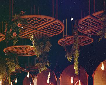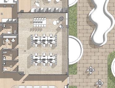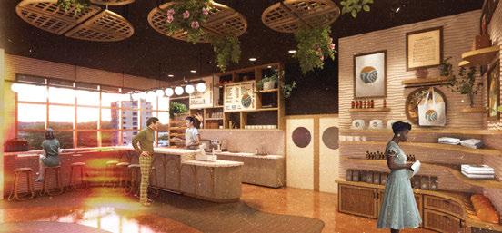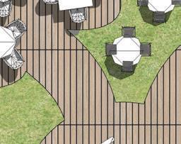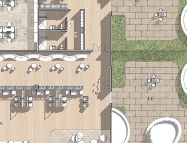The multi-function outdoor area of SWR/CO exhibits a variety of seating options. These include deck seating seating, banquettes built into the landscape, turf dining dining, the lounge deck, and the Shroom Saloon Shroom Saloon, a sustainable bar design with solar powered lighting. Pathways that mirror the riverbanks of North Florida weave alongside the movement of people. A takeout window is featured to lessen the distance for employees to travel with food and dishes. The outdoor area is suitable for day or night use, and accounts for room for food trucks and other vendors to visit.