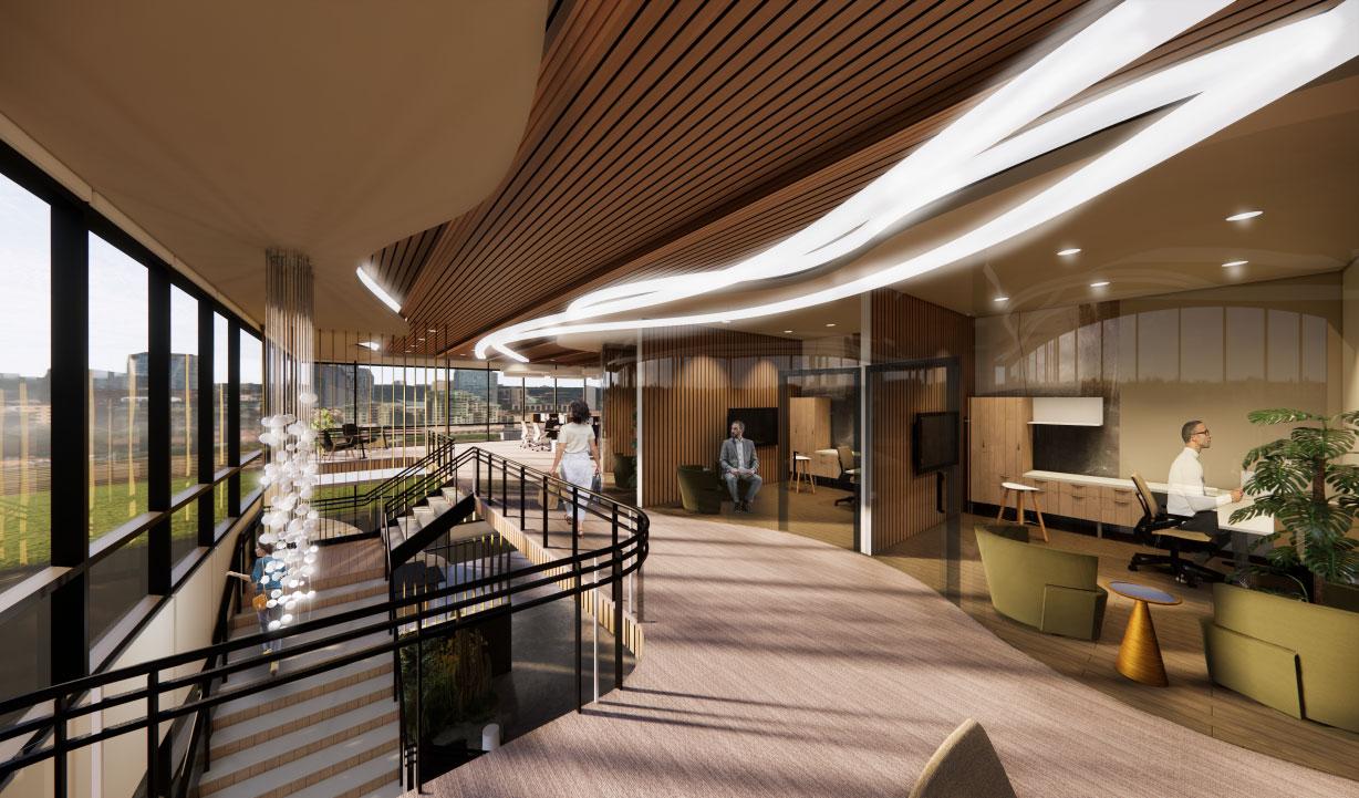 An upstairs corridor is illuminated by free flow LED lights. Typical offices enclosed by glass curtain walls maintain an open, breathable office while keeping an open plan. Typical offices are shown near the landing from the monumental stair, which then moves into a bustling work zone. Areas of focus and activity are interwoven to create a high energy, creative workplace