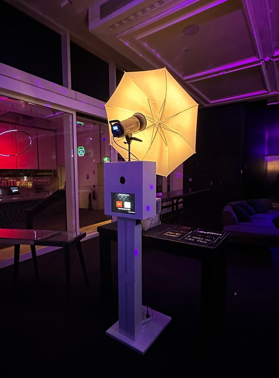 A spacious, free-standing booth equipped with a DSLR camera, professional lighting, customizable photo strips, instant sharing, and unlimited prints for groups big or small.