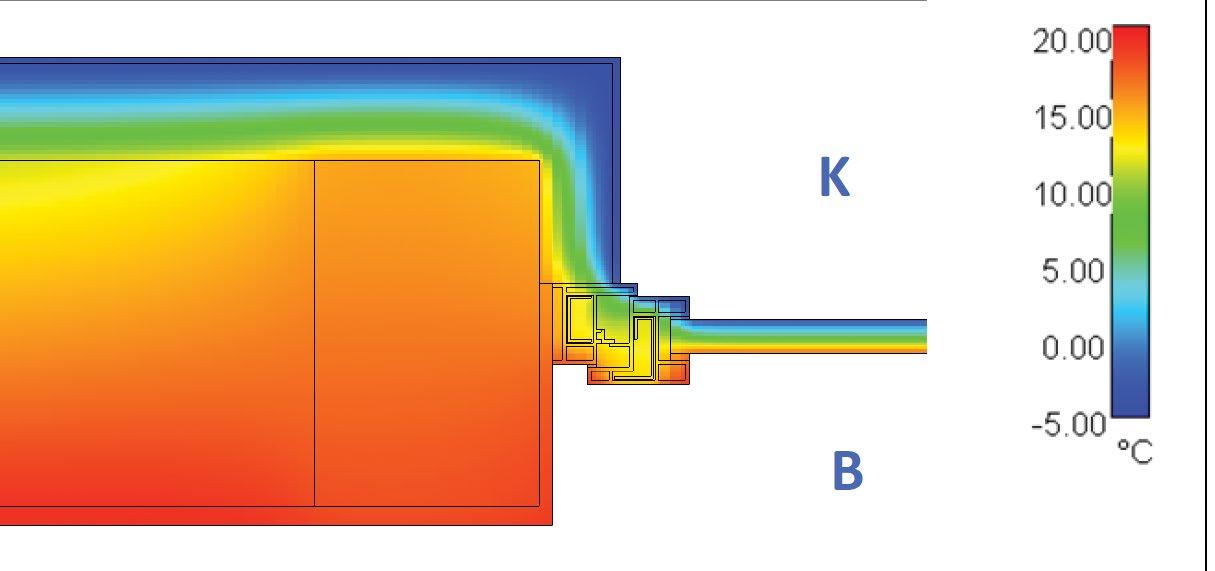 5. ábra: Ablakbeépítés csomópont hőmérséklet-eloszlásának számítógépes modellezése.