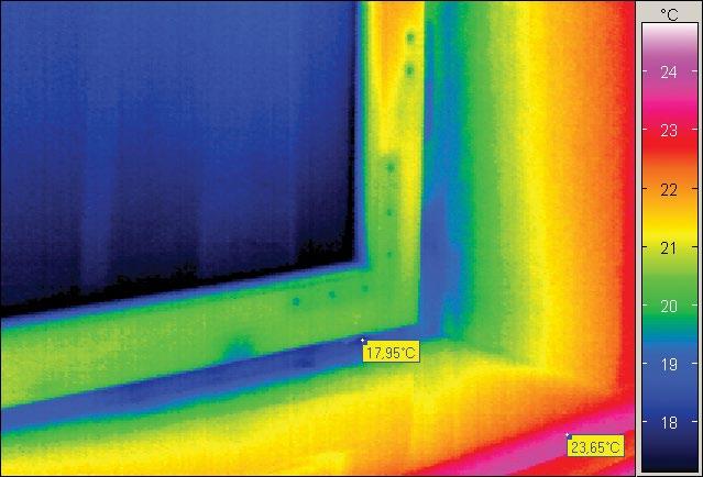 4. ábra: Jellegzetes hőmérséklet-eloszlás ablakkávában (hagyományos ablak belső oldaláról készült hőfotó)