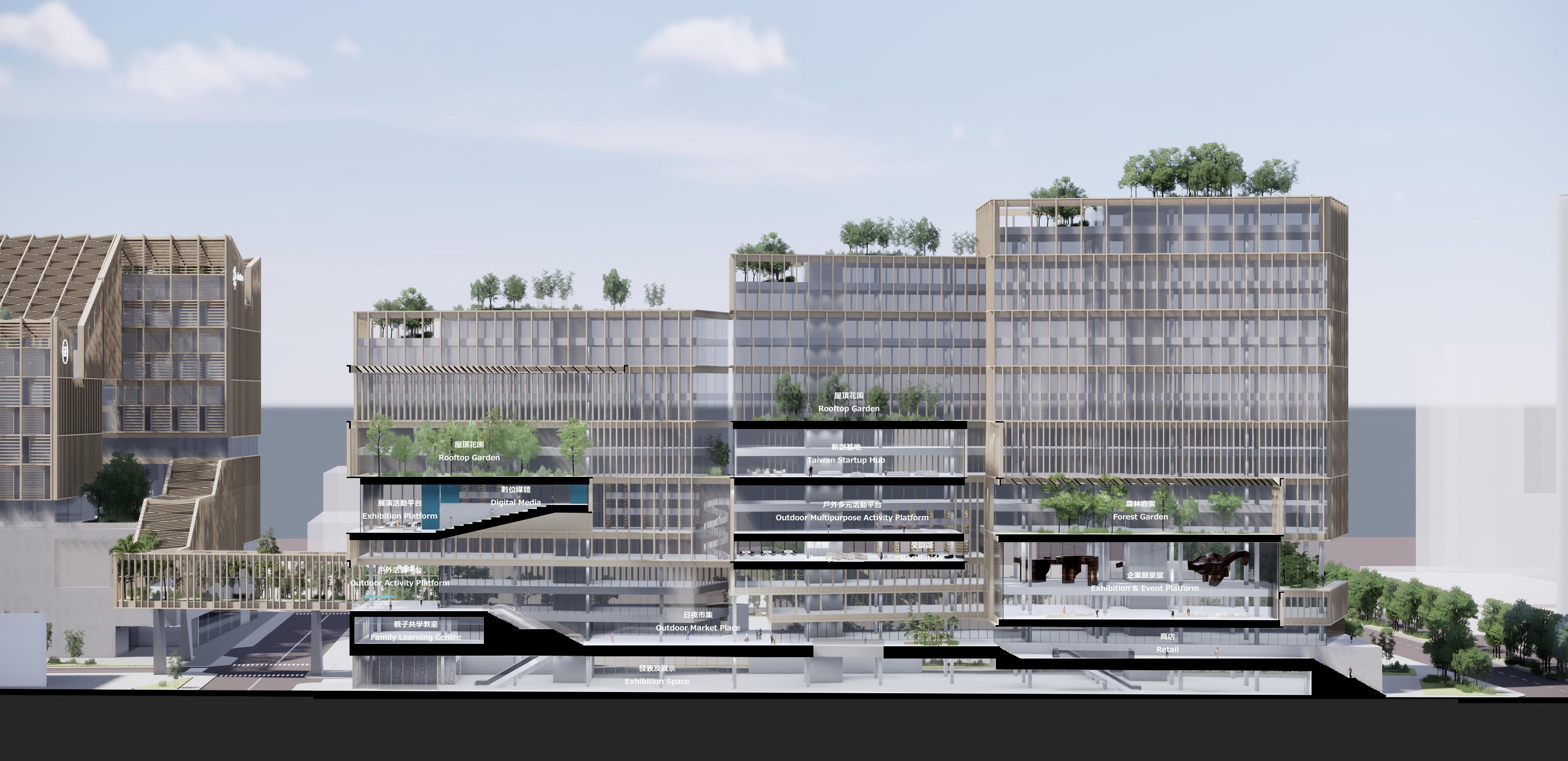 This one on the left is a concept design for a technology hub for Accton Technology in the city of Hsinchu, where it’s known for the Sillicon Valley of Taiwan. The company wanted a new place for the headquarter, factory, and the public to come together to bring the community around together and maximise the use of every space.