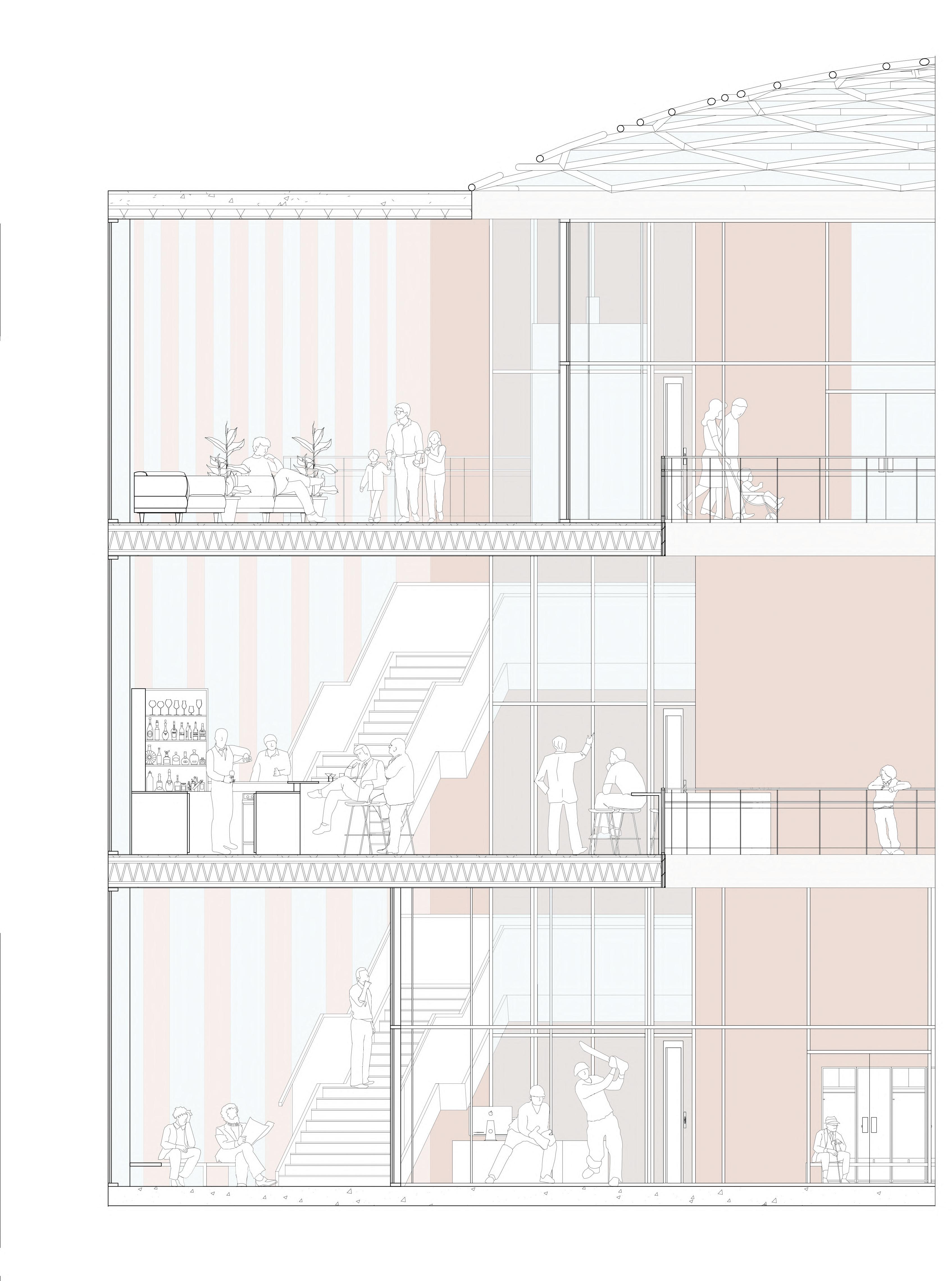 There are three key spaces for the proposal - a cricket ground on the bottom floor, a restaurant/bar for cricket fans on the middle floor, and a library about cricket on the top floor. The programmes are selected according to main users’ needs and the proposal here to bring the whole community together.