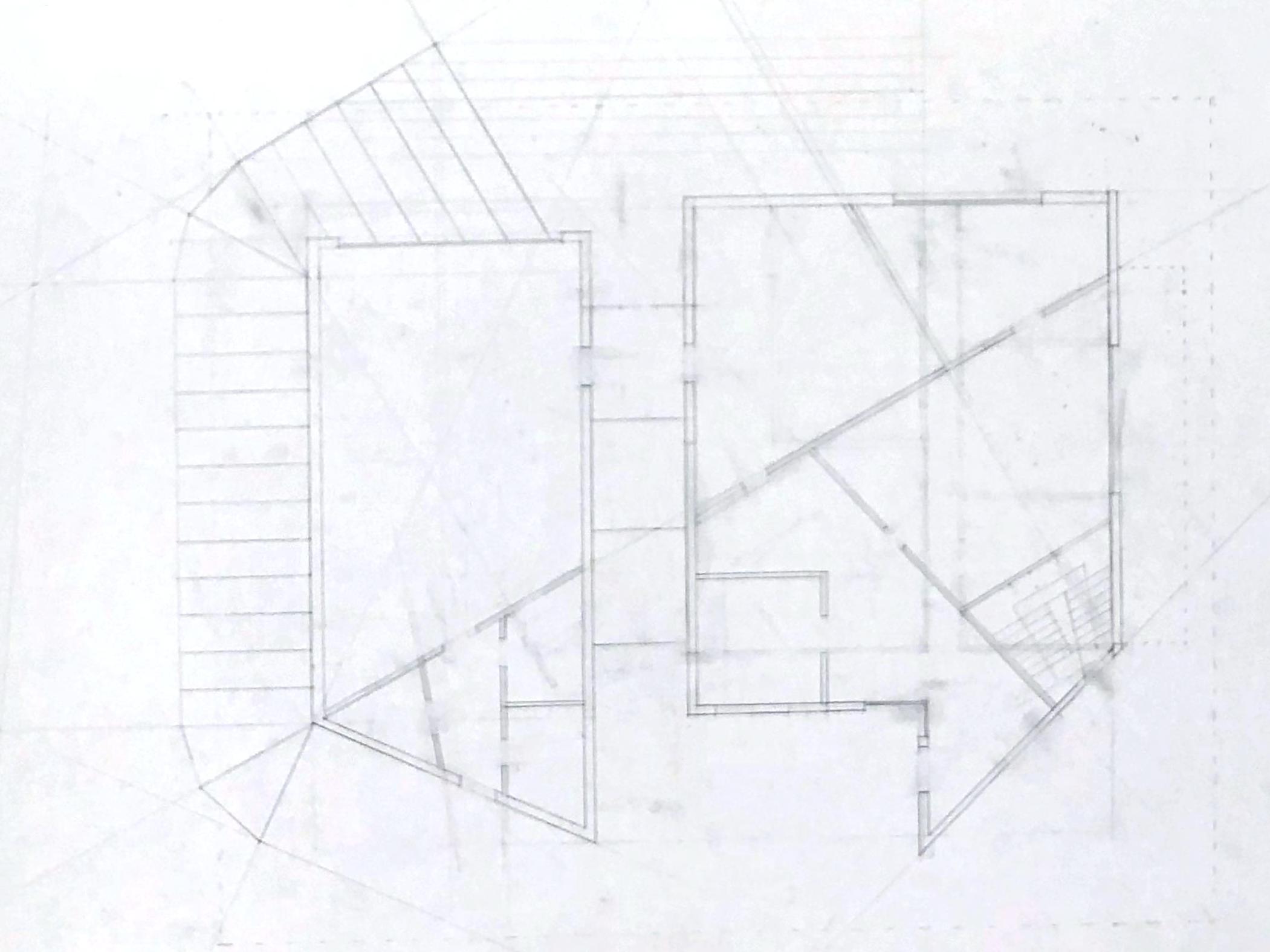 In floor plans, the geometric lines are explored as different rooms to house programs within. Explored in volumes as a physical model, the geometric lines are drawn from the surrounding site slice directly through the structure before being joined back together.