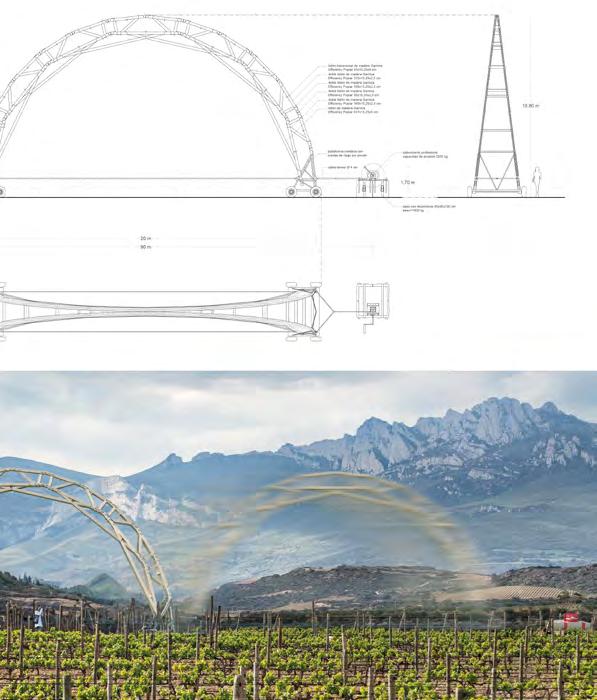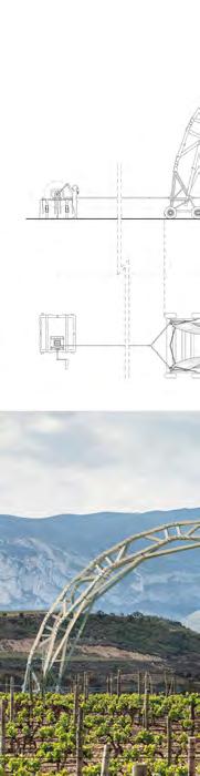 We introduce the possibility of the structure being movable. Eight wheels are placed at the foot of the falsework and stiffened at its base. By means of two winches placed at the ends of the path, the structure can be moved along it. In this way, the arches move between the vineyards, propelled by the visitors who become shapers of the landscape. The distance between the two winches allows for four arches to be inscribed, precisely the number of arches missing from the Mantible bridge. In our contemporaneity, the bridge becomes an artefact that moves through the landscape.